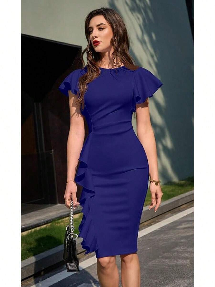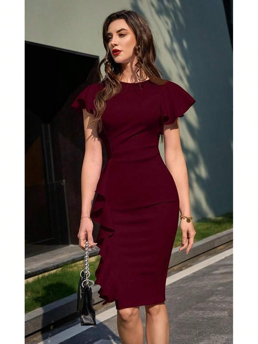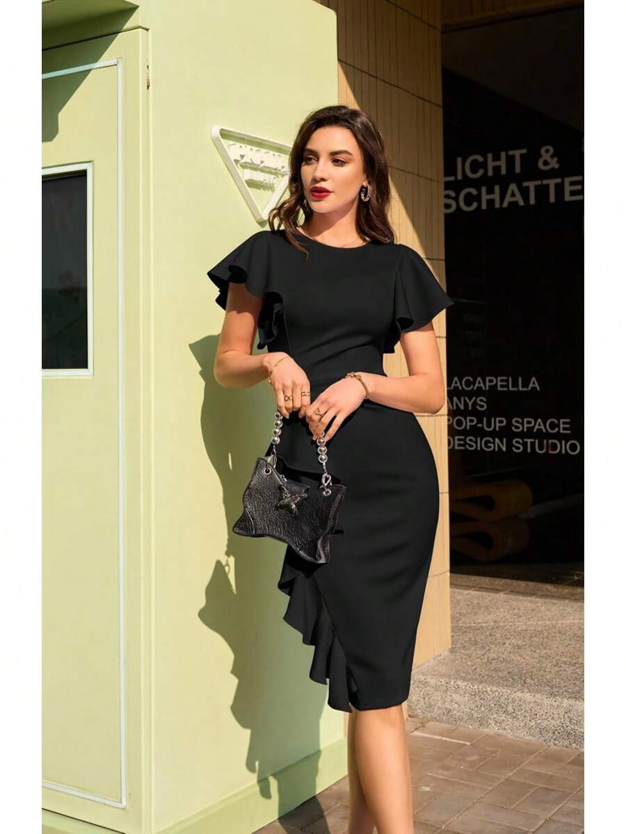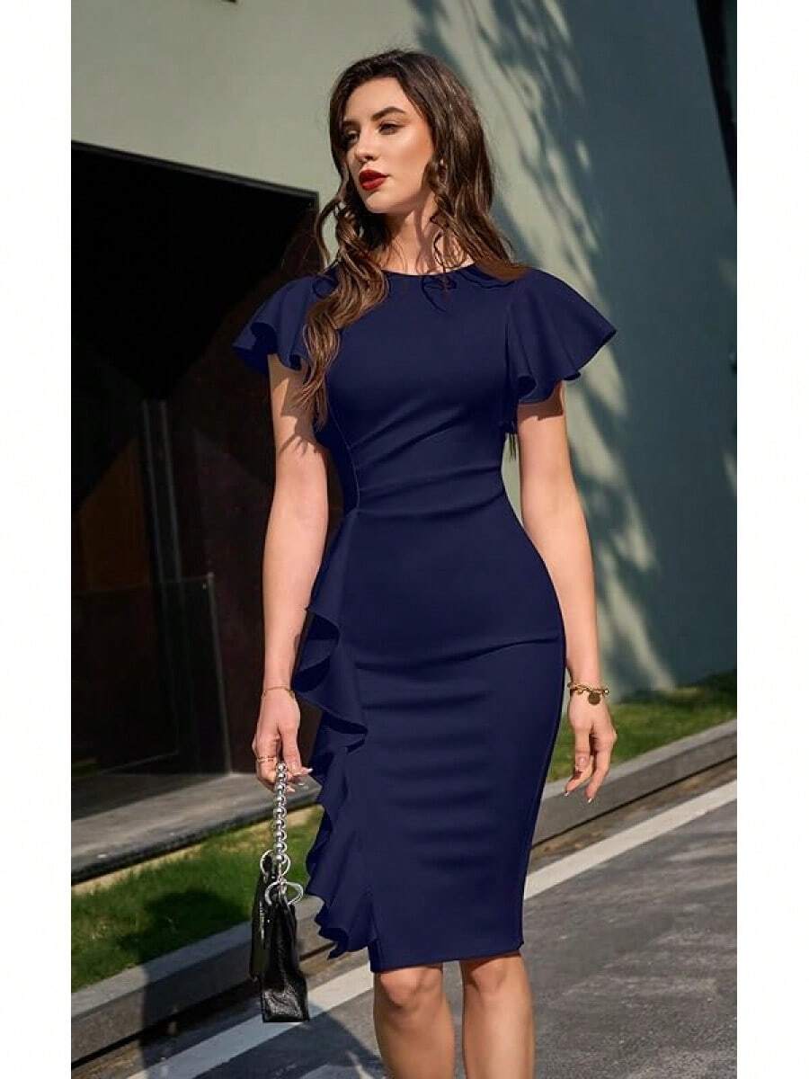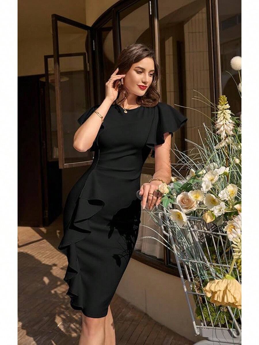 The Lillian dress is a refined statement — equal parts poised and powerful. With flutter sleeves, a sculpted bodycon silhouette, and cascading ruffle detail, this midi dress blends femininity with confidence. Whether you’re headed to a wedding, a work event, or a formal dinner, Lillian makes every entrance unforgettable.