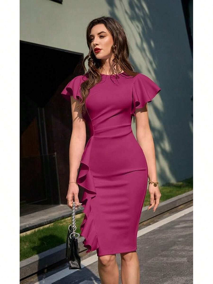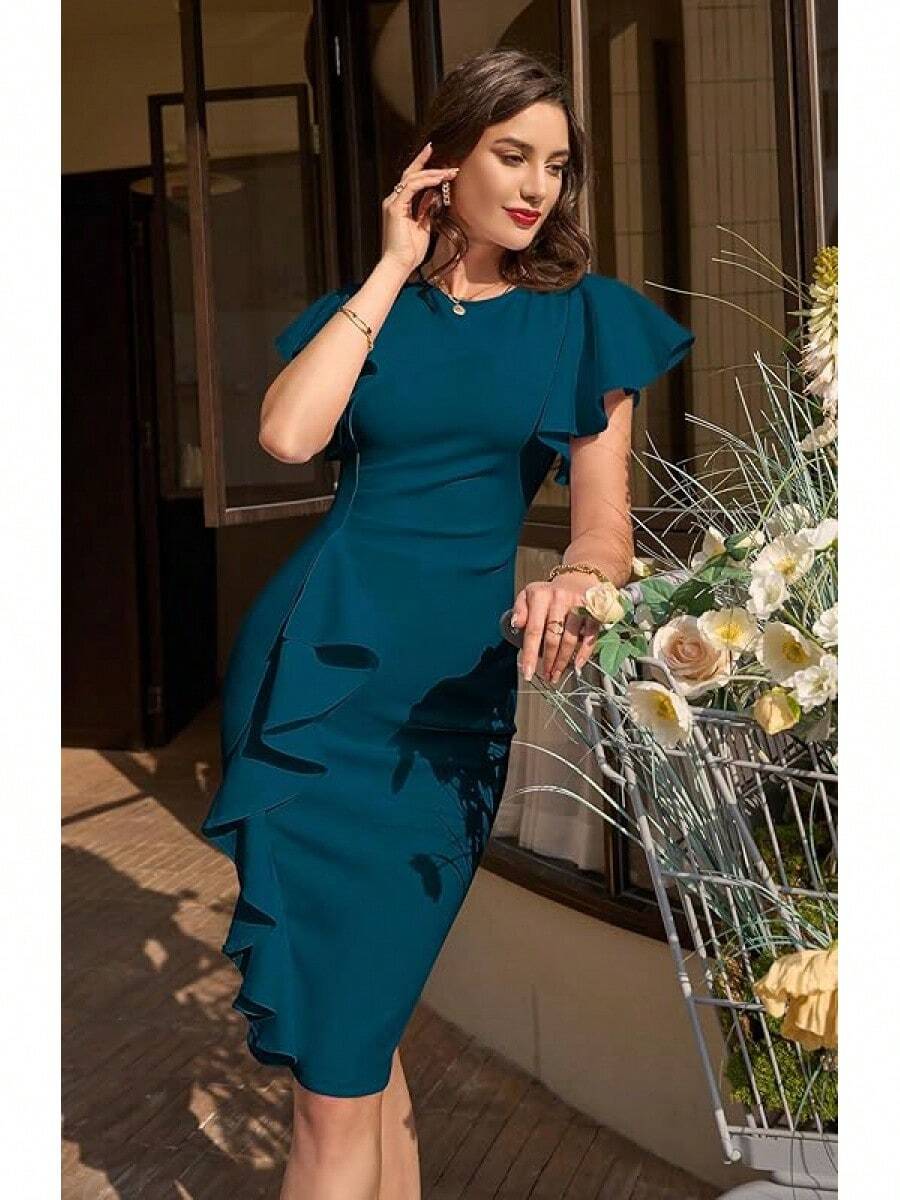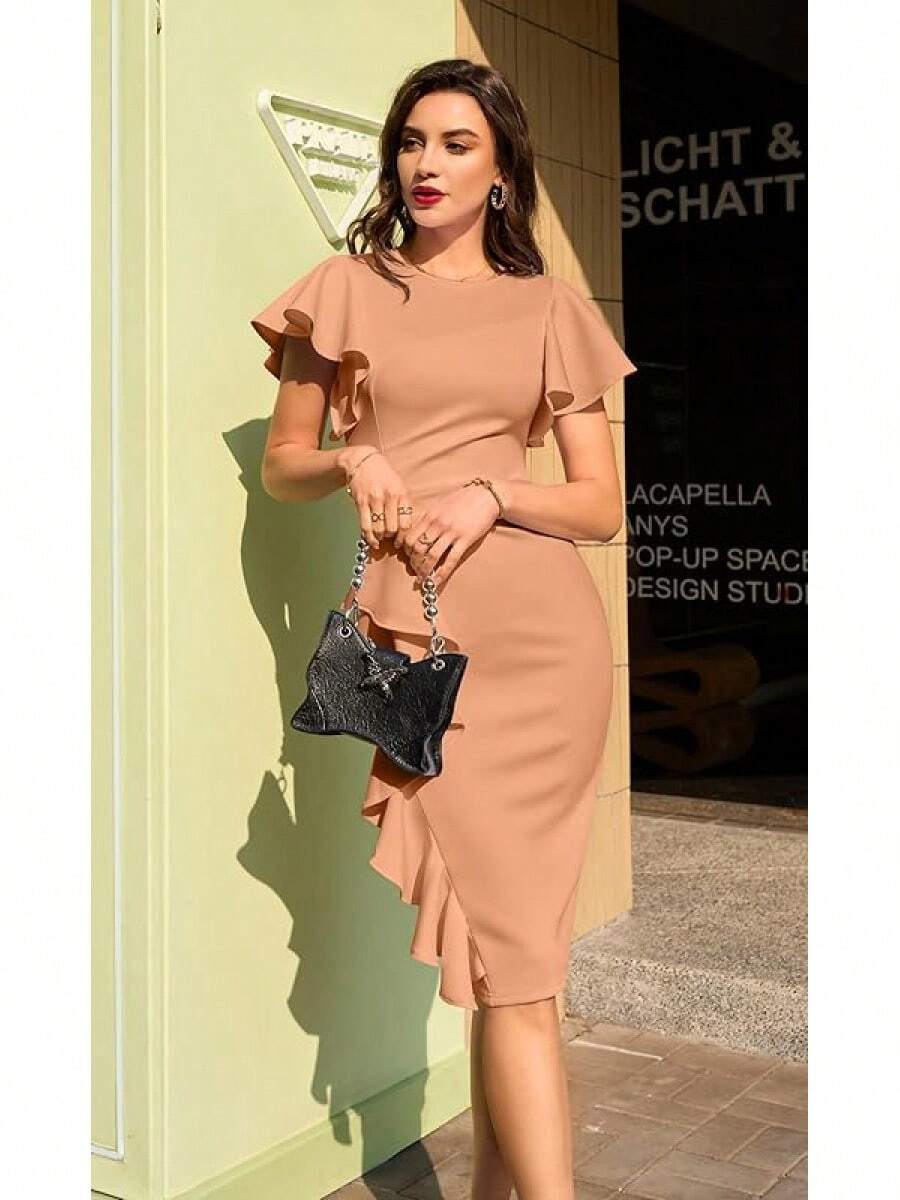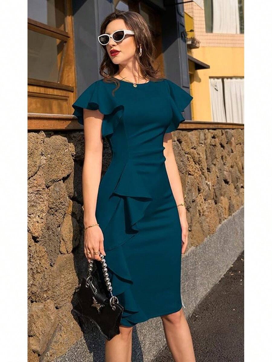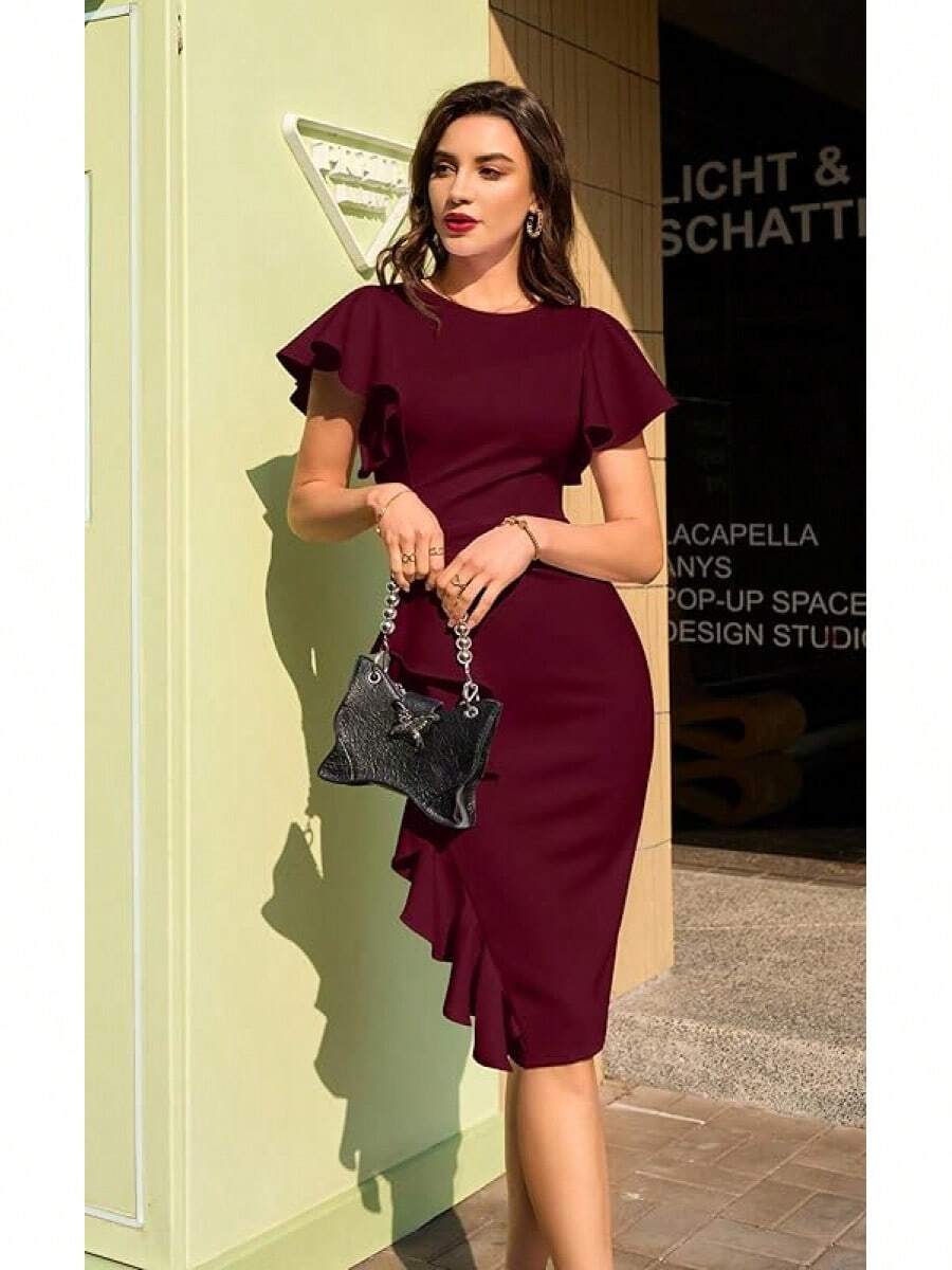 The Lillian dress is a refined statement — equal parts poised and powerful. With flutter sleeves, a sculpted bodycon silhouette, and cascading ruffle detail, this midi dress blends femininity with confidence. Whether you’re headed to a wedding, a work event, or a formal dinner, Lillian makes every entrance unforgettable.