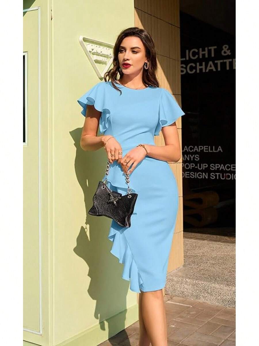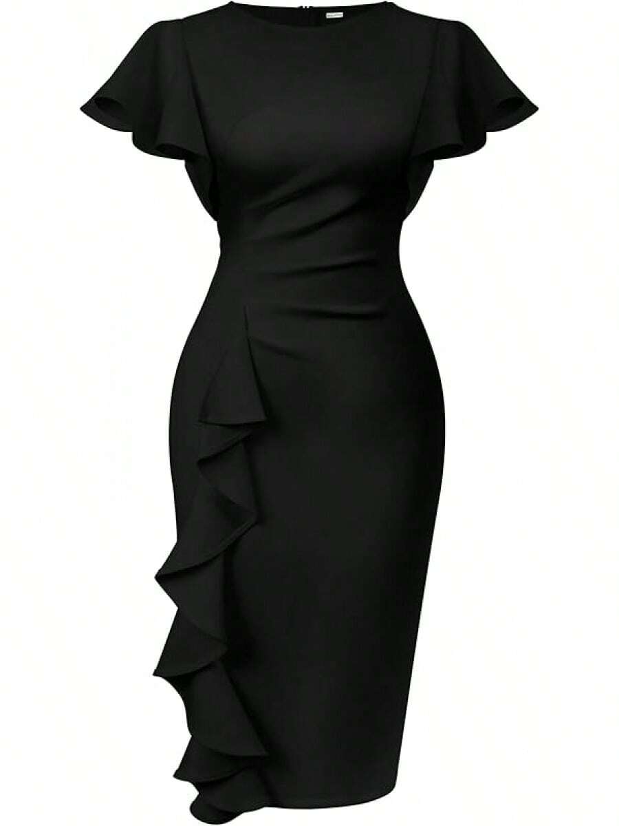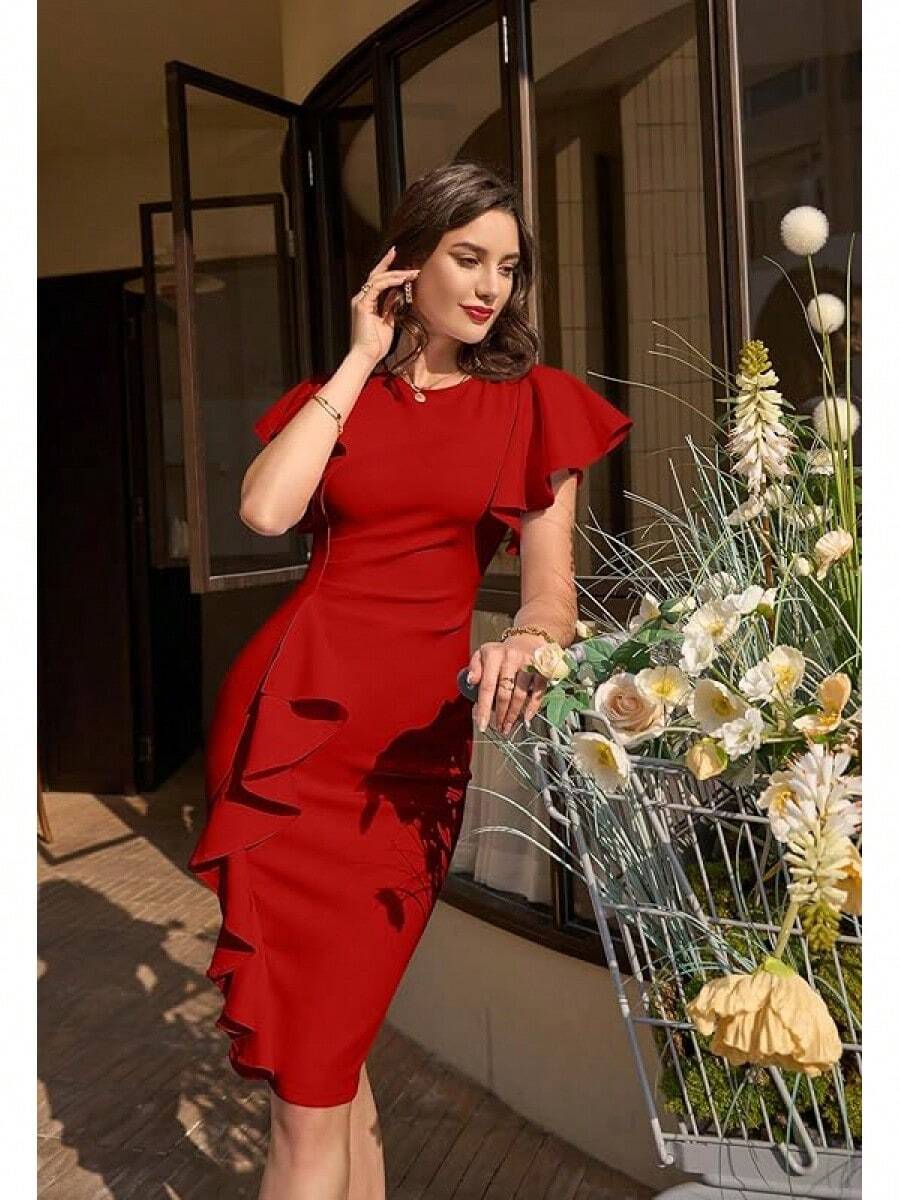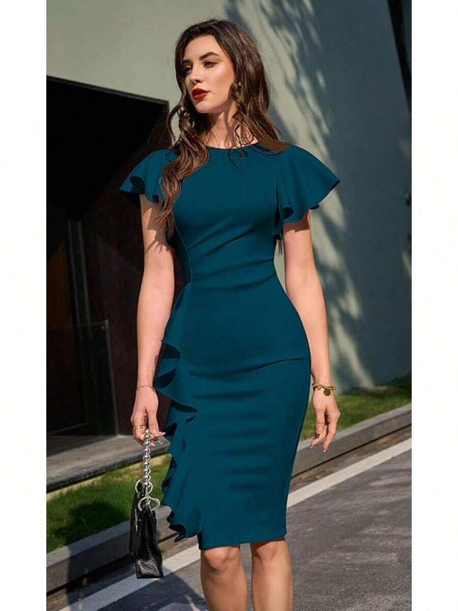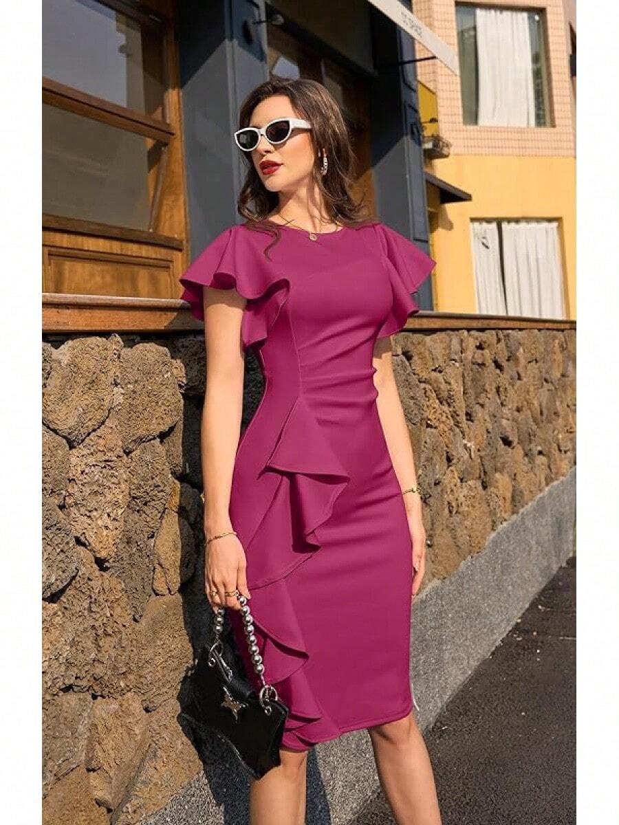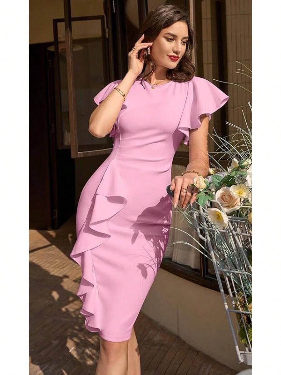 The Lillian dress is a refined statement — equal parts poised and powerful. With flutter sleeves, a sculpted bodycon silhouette, and cascading ruffle detail, this midi dress blends femininity with confidence. Whether you’re headed to a wedding, a work event, or a formal dinner, Lillian makes every entrance unforgettable.