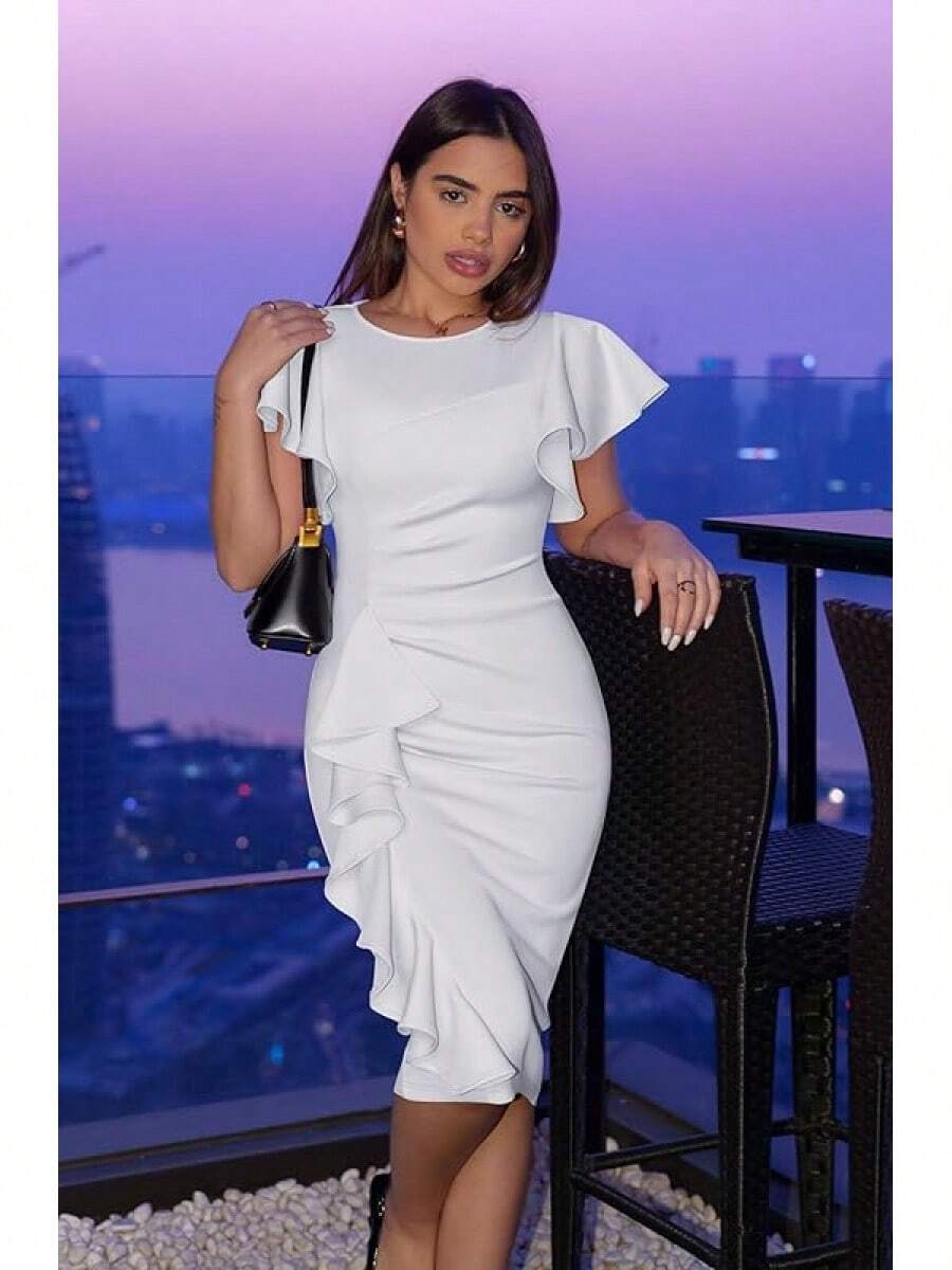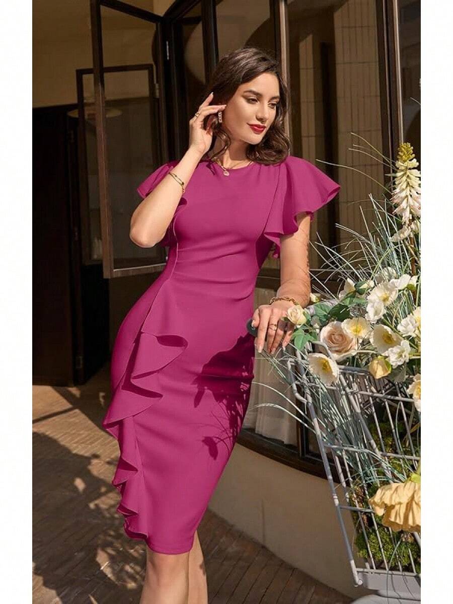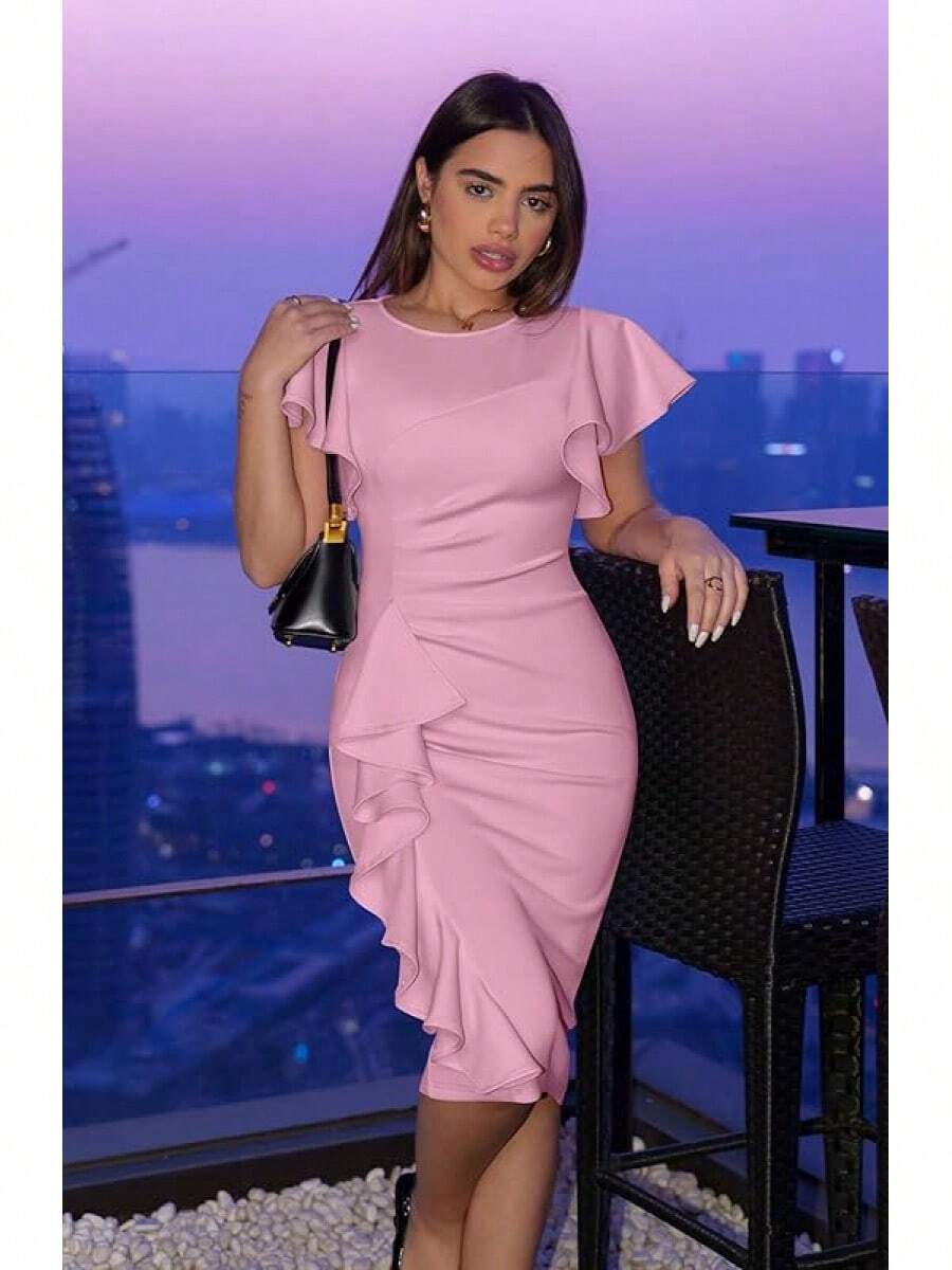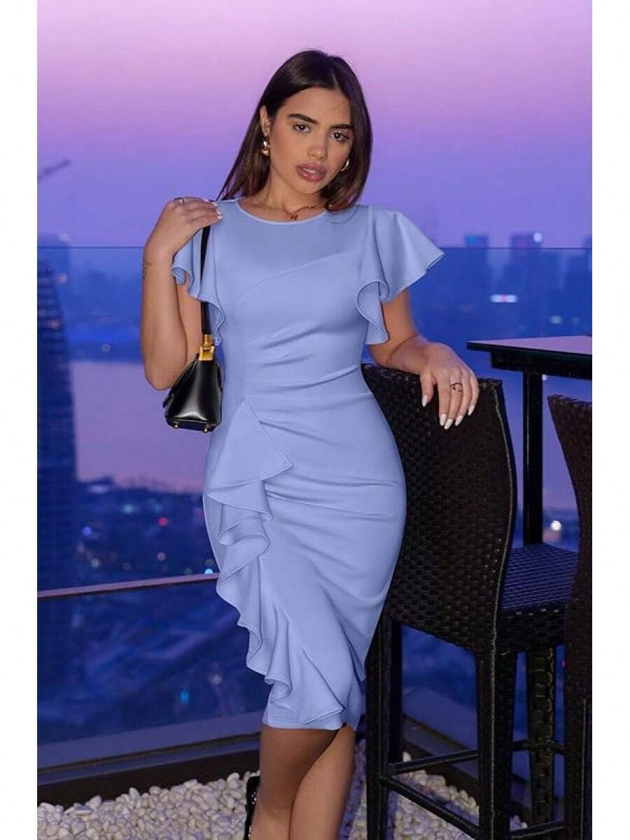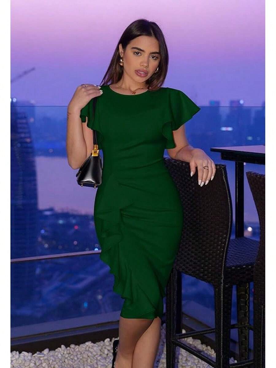 The Lillian dress is a refined statement — equal parts poised and powerful. With flutter sleeves, a sculpted bodycon silhouette, and cascading ruffle detail, this midi dress blends femininity with confidence. Whether you’re headed to a wedding, a work event, or a formal dinner, Lillian makes every entrance unforgettable.