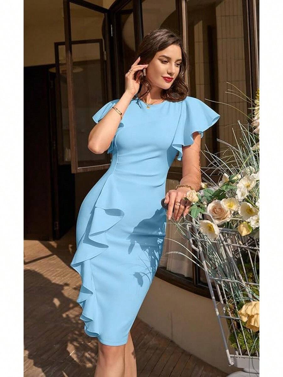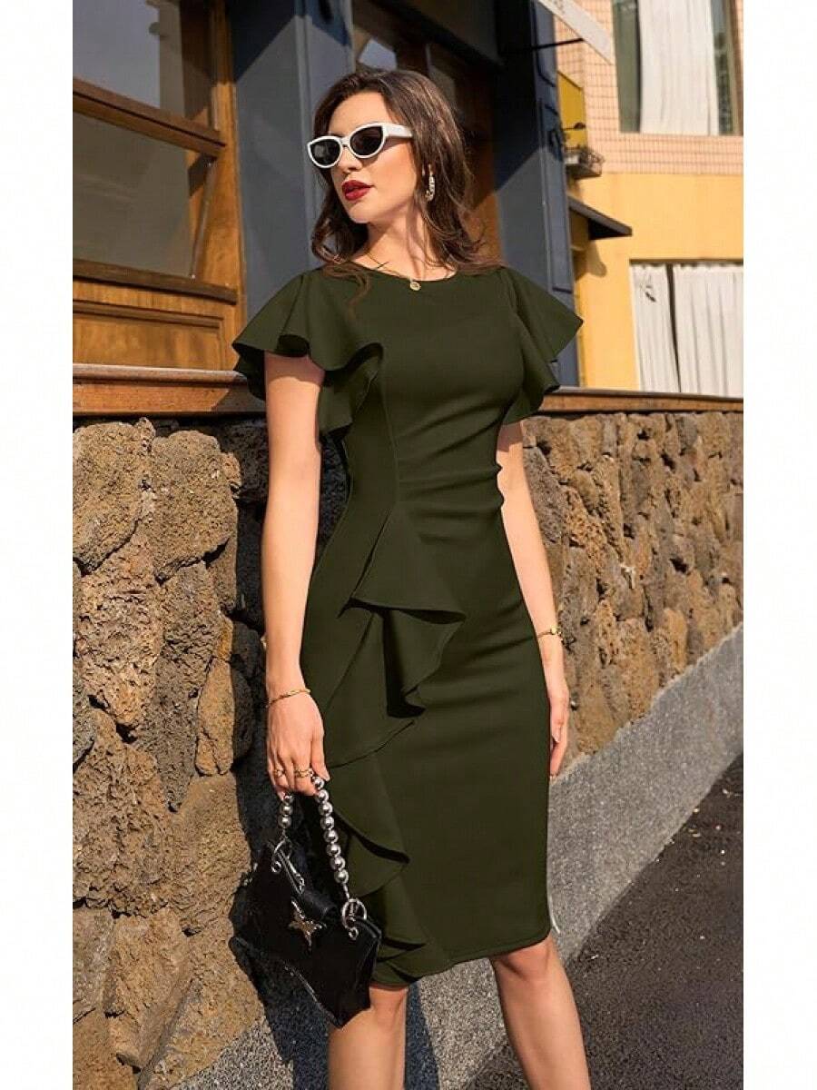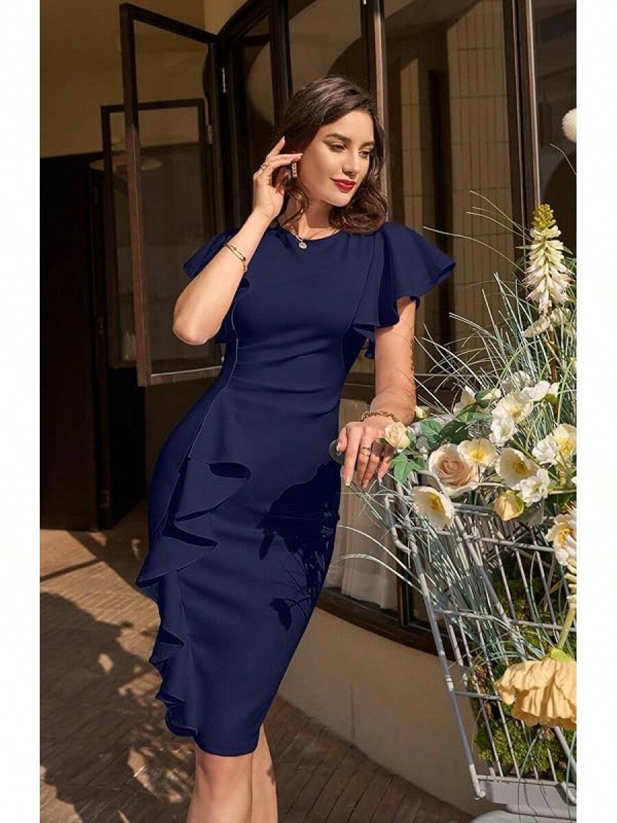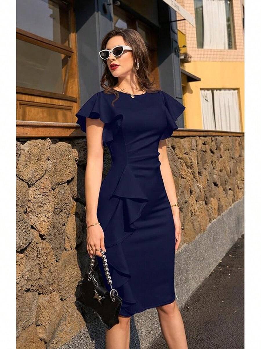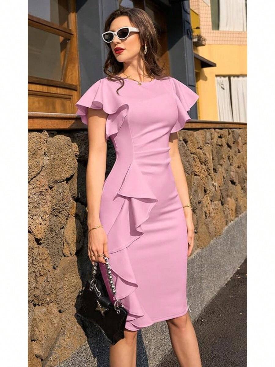 The Lillian dress is a refined statement — equal parts poised and powerful. With flutter sleeves, a sculpted bodycon silhouette, and cascading ruffle detail, this midi dress blends femininity with confidence. Whether you’re headed to a wedding, a work event, or a formal dinner, Lillian makes every entrance unforgettable.