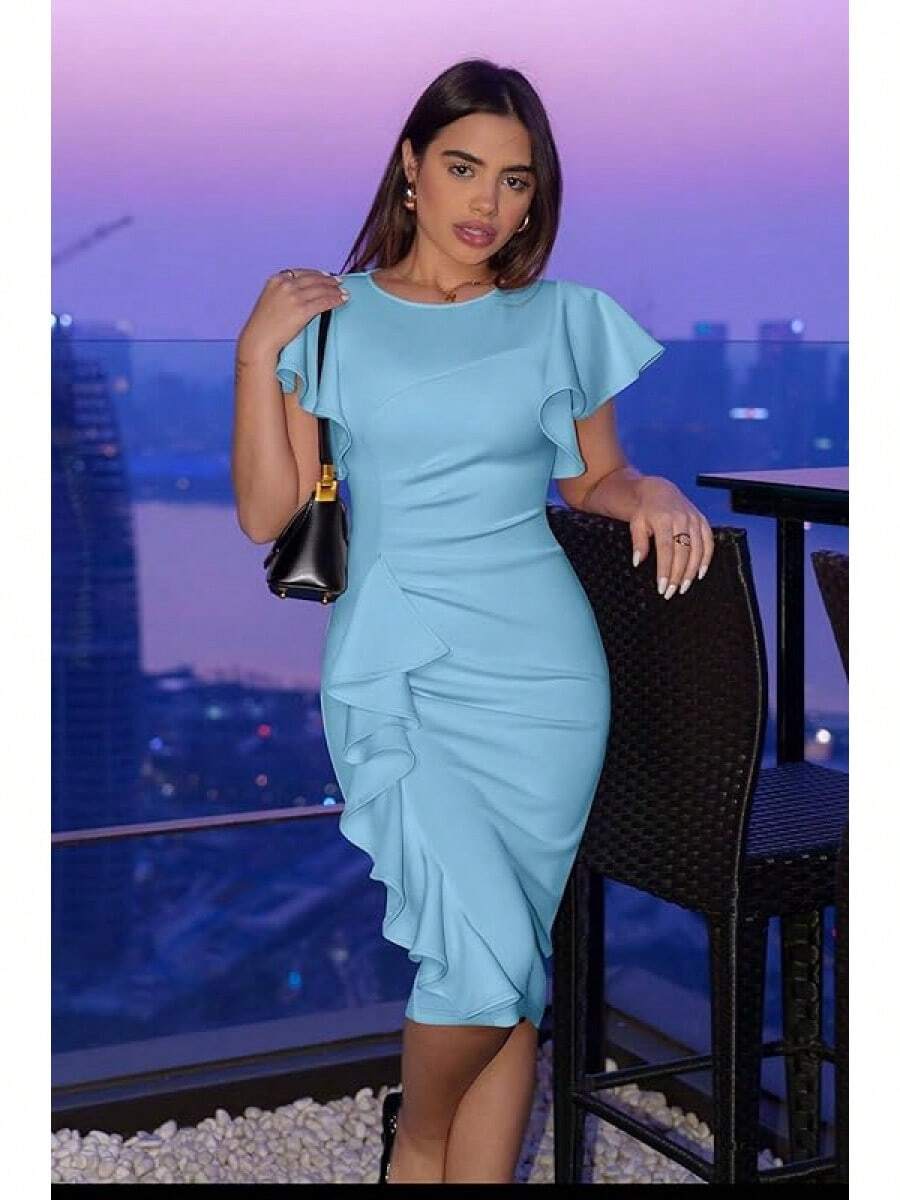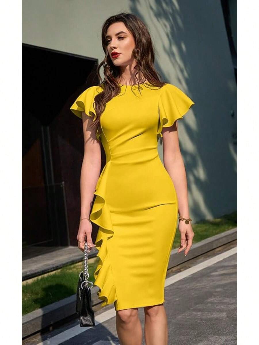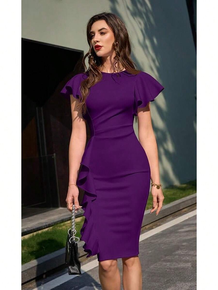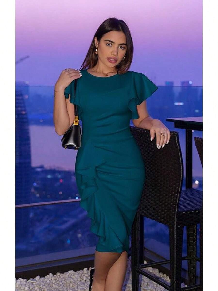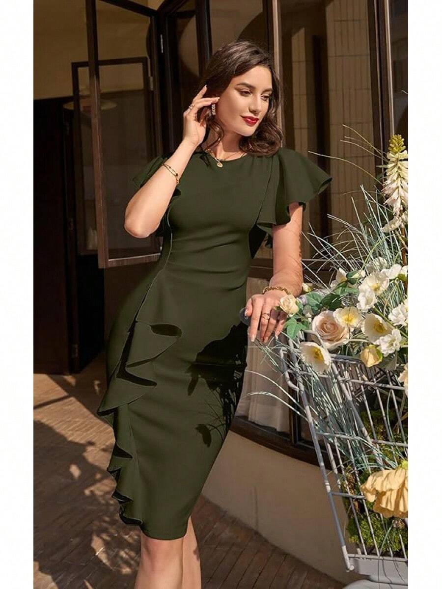 The Lillian dress is a refined statement — equal parts poised and powerful. With flutter sleeves, a sculpted bodycon silhouette, and cascading ruffle detail, this midi dress blends femininity with confidence. Whether you’re headed to a wedding, a work event, or a formal dinner, Lillian makes every entrance unforgettable.