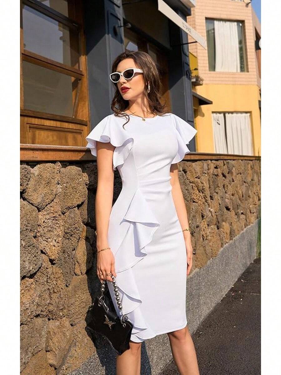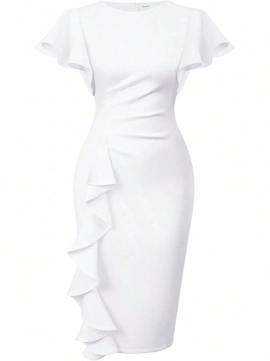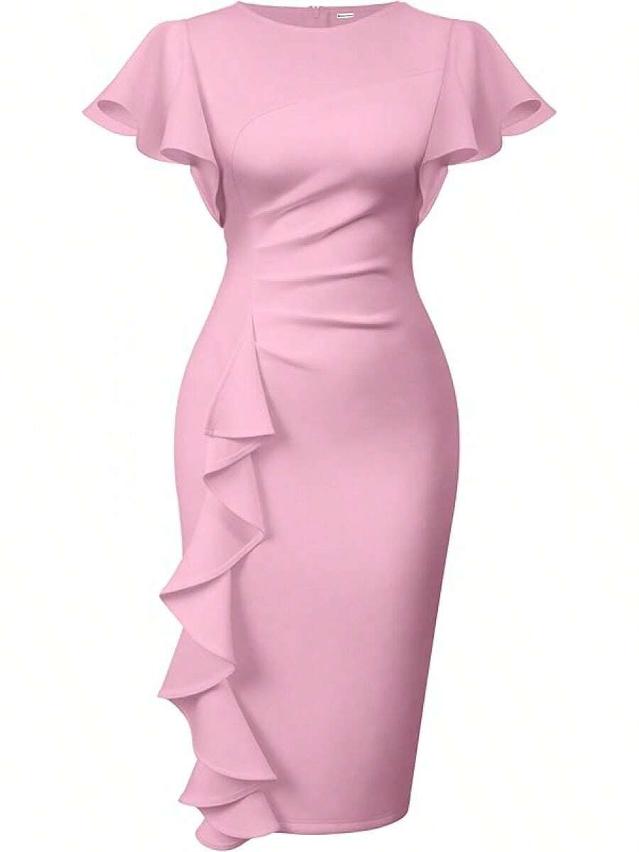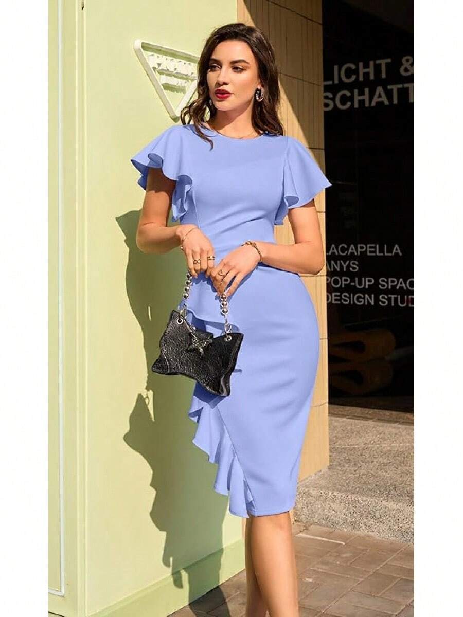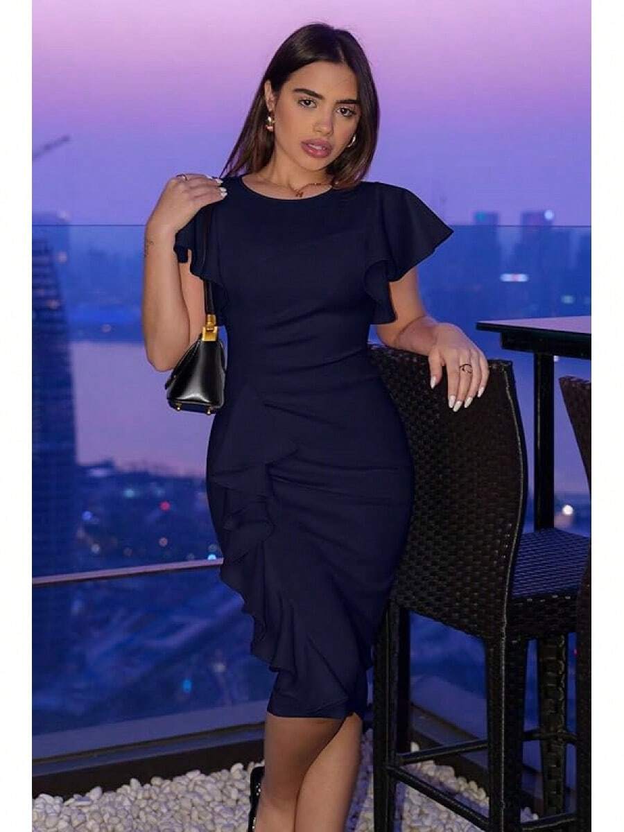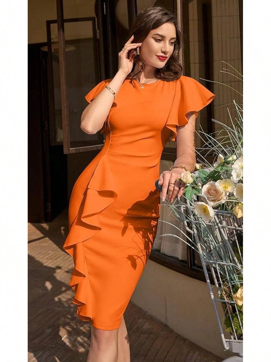 The Lillian dress is a refined statement — equal parts poised and powerful. With flutter sleeves, a sculpted bodycon silhouette, and cascading ruffle detail, this midi dress blends femininity with confidence. Whether you’re headed to a wedding, a work event, or a formal dinner, Lillian makes every entrance unforgettable.