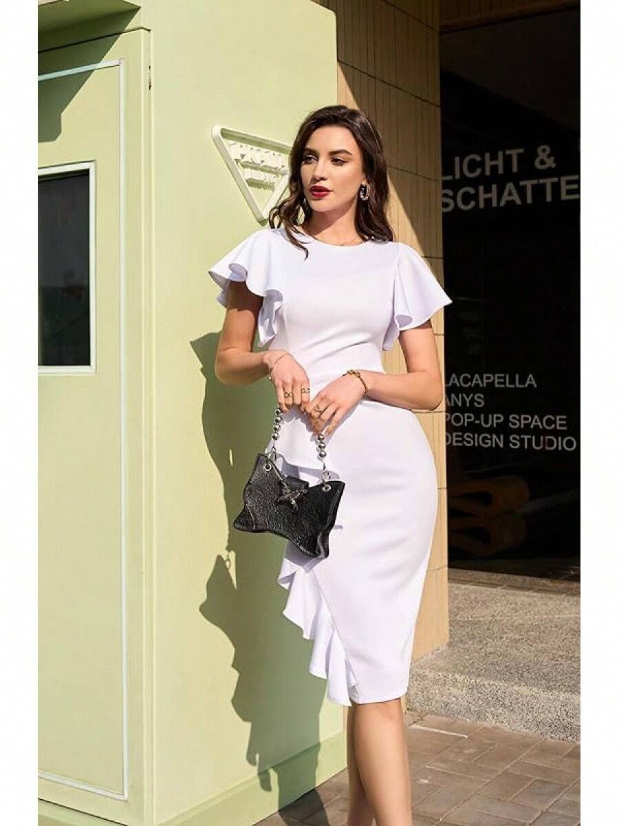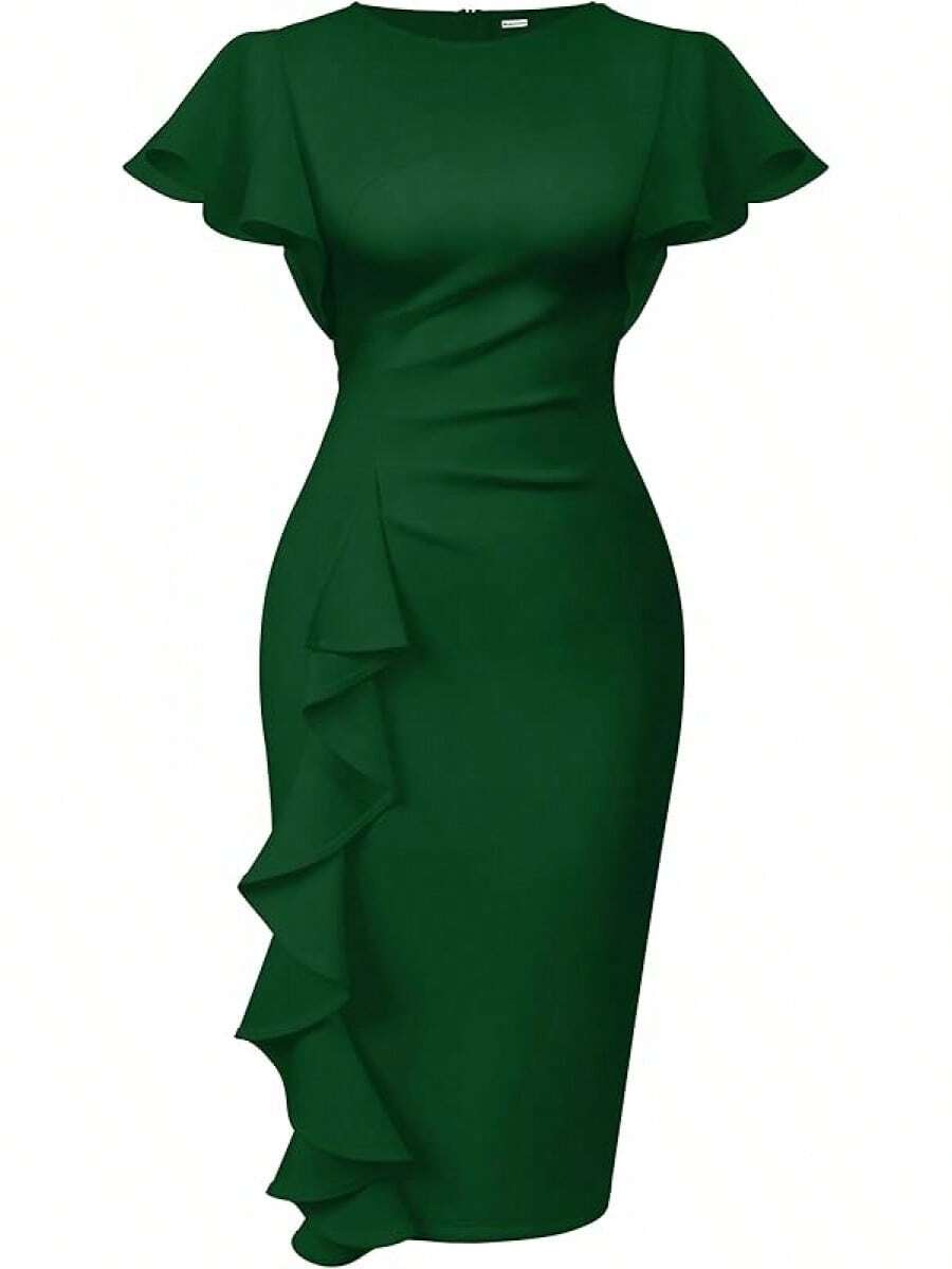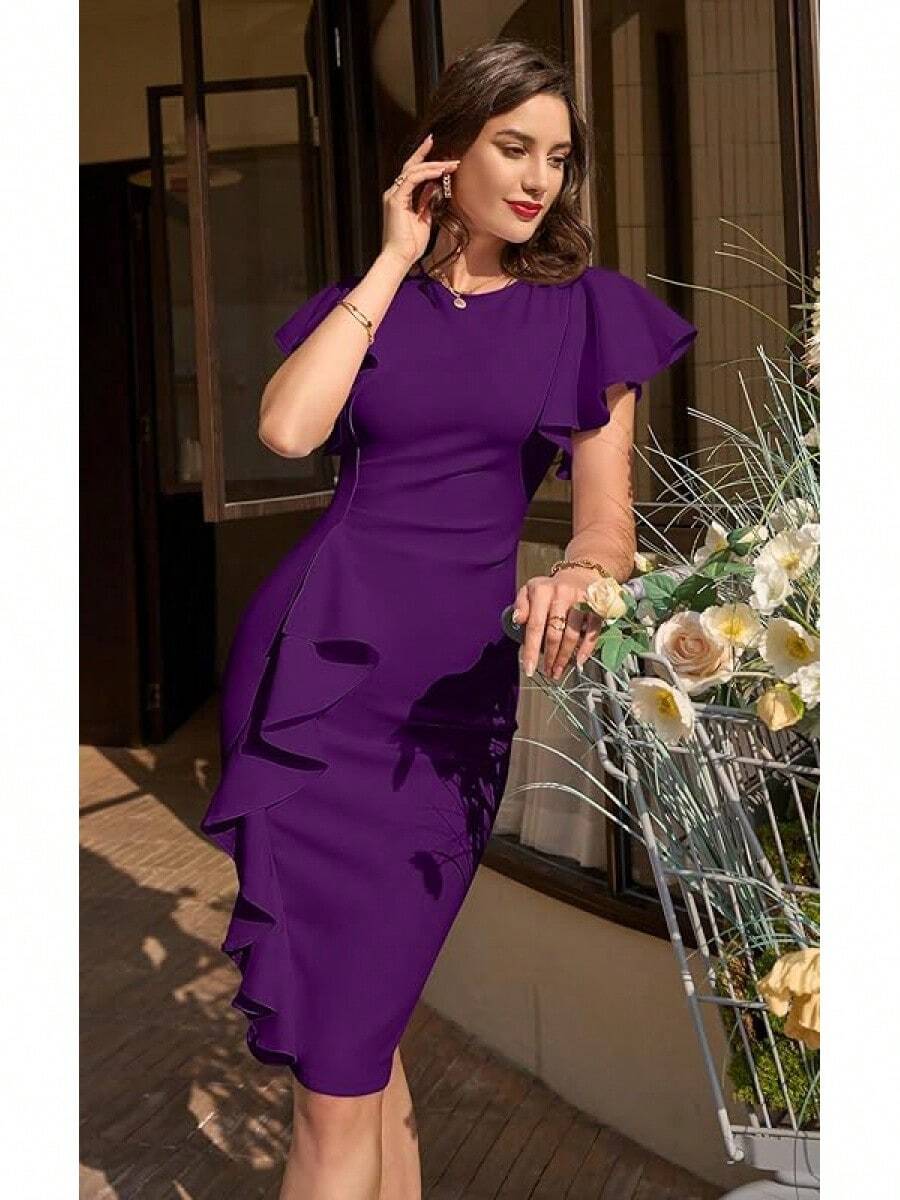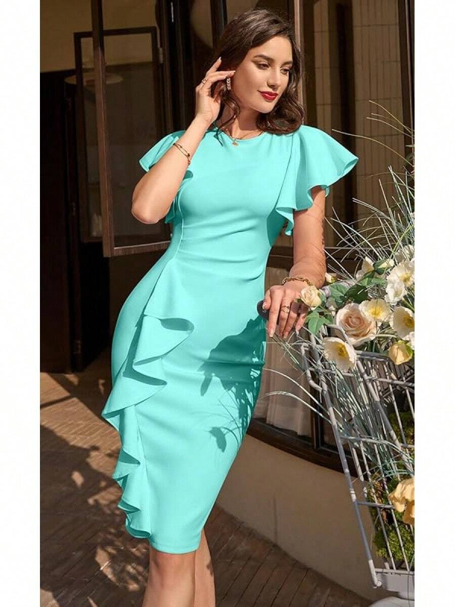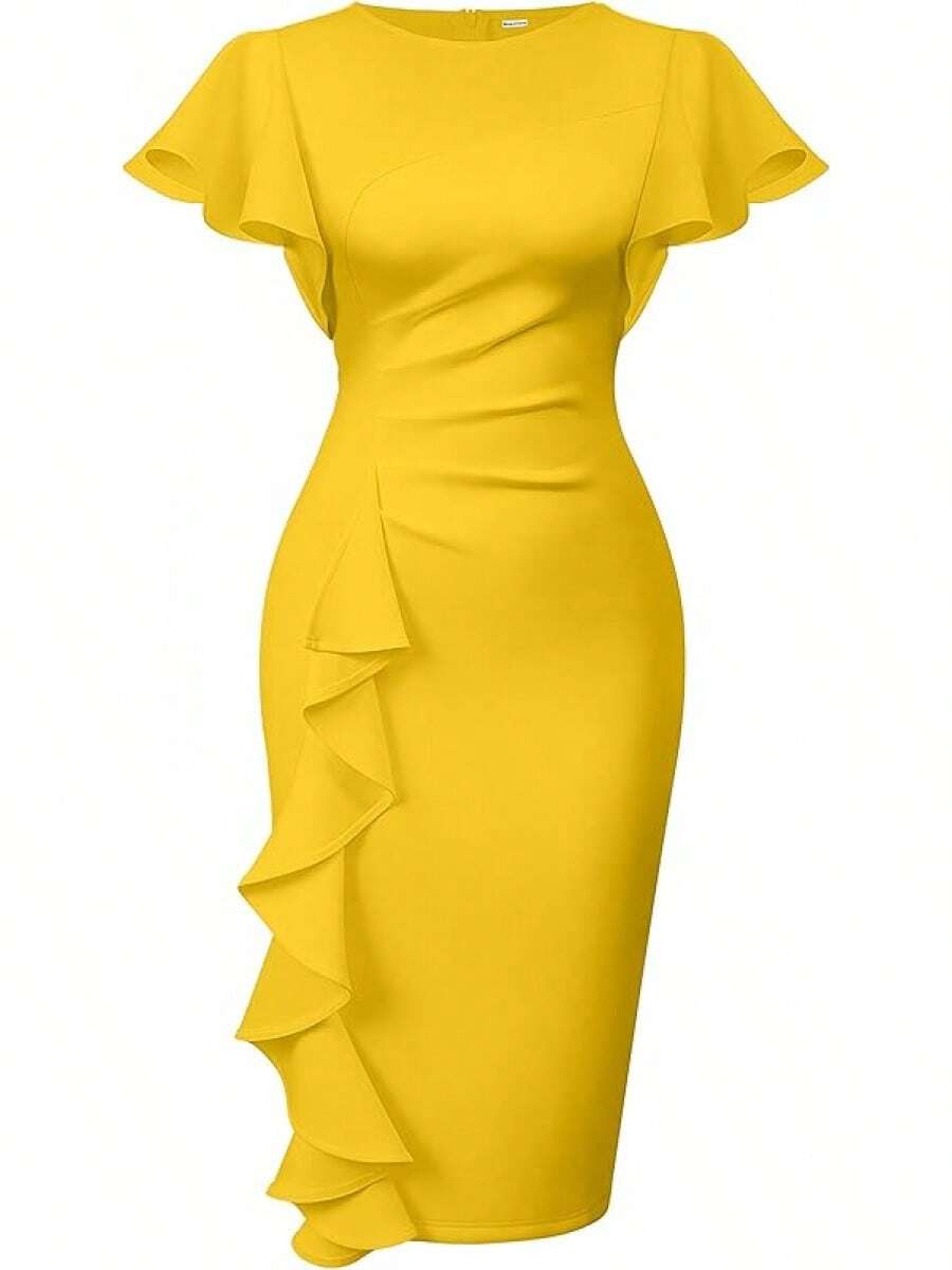 The Lillian dress is a refined statement — equal parts poised and powerful. With flutter sleeves, a sculpted bodycon silhouette, and cascading ruffle detail, this midi dress blends femininity with confidence. Whether you’re headed to a wedding, a work event, or a formal dinner, Lillian makes every entrance unforgettable.