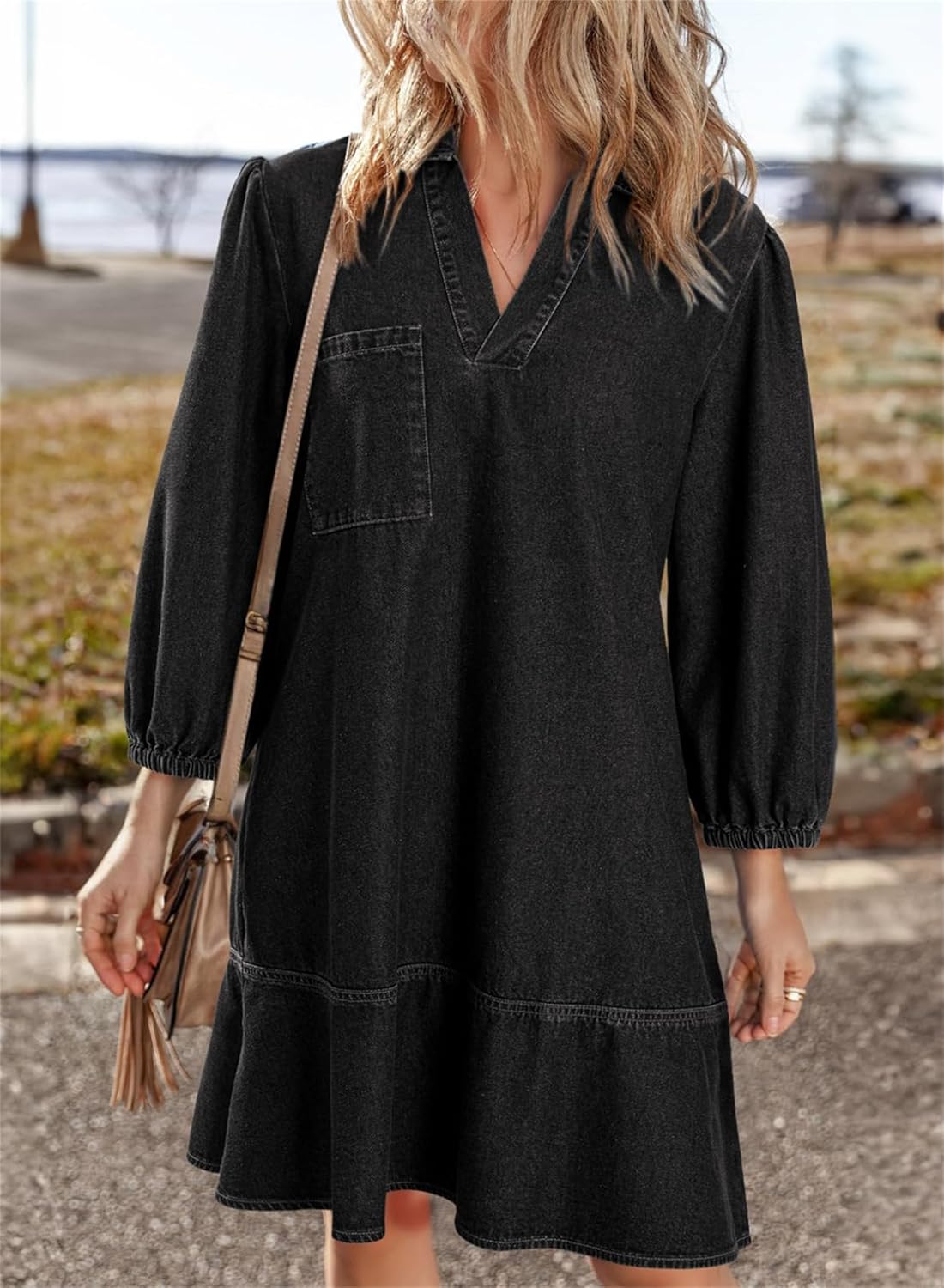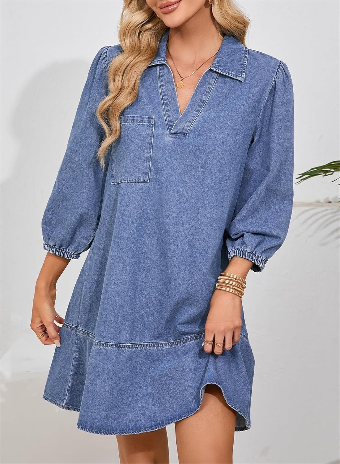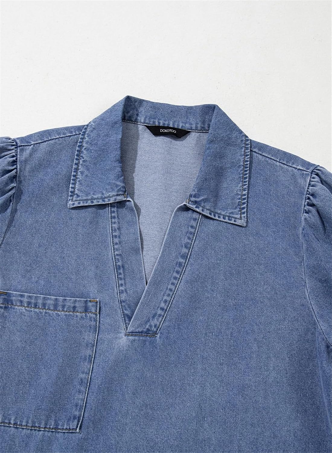 Dovanni | V-Neck Puff Sleeve Denim Babydoll Dress