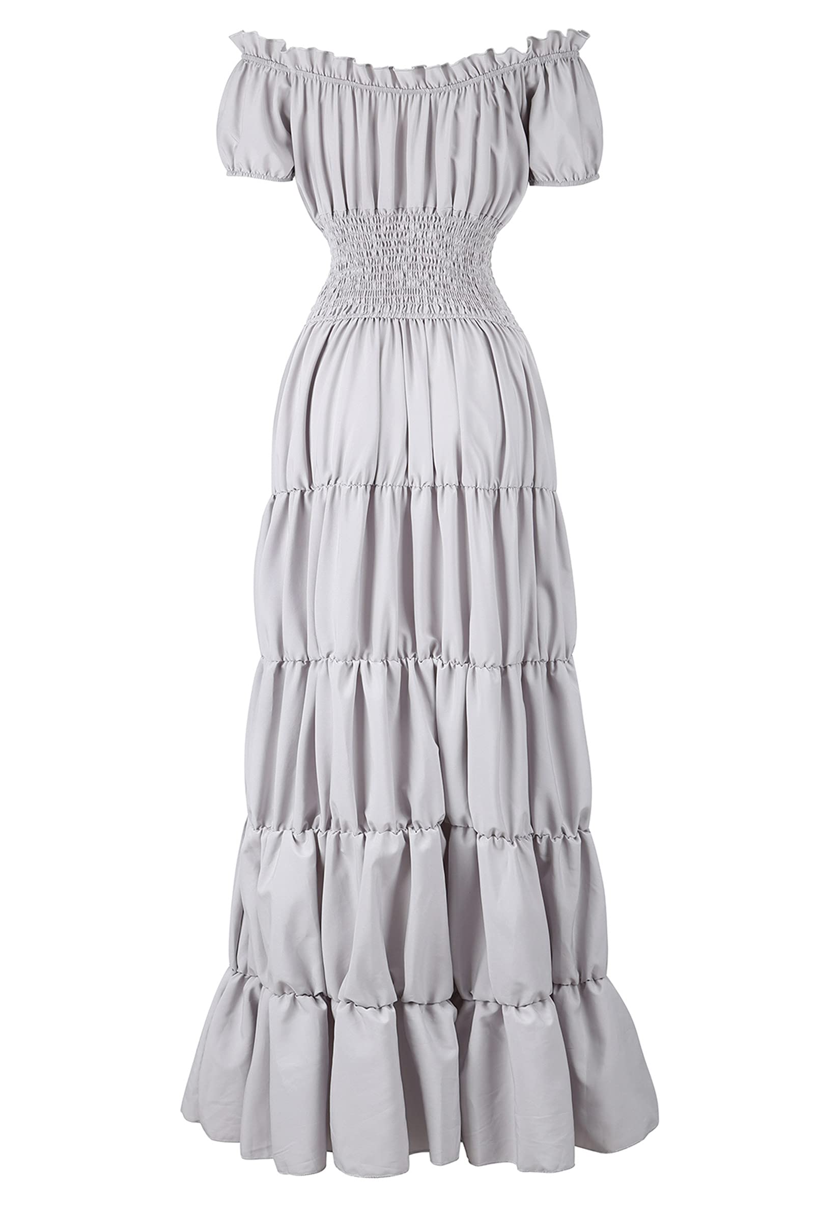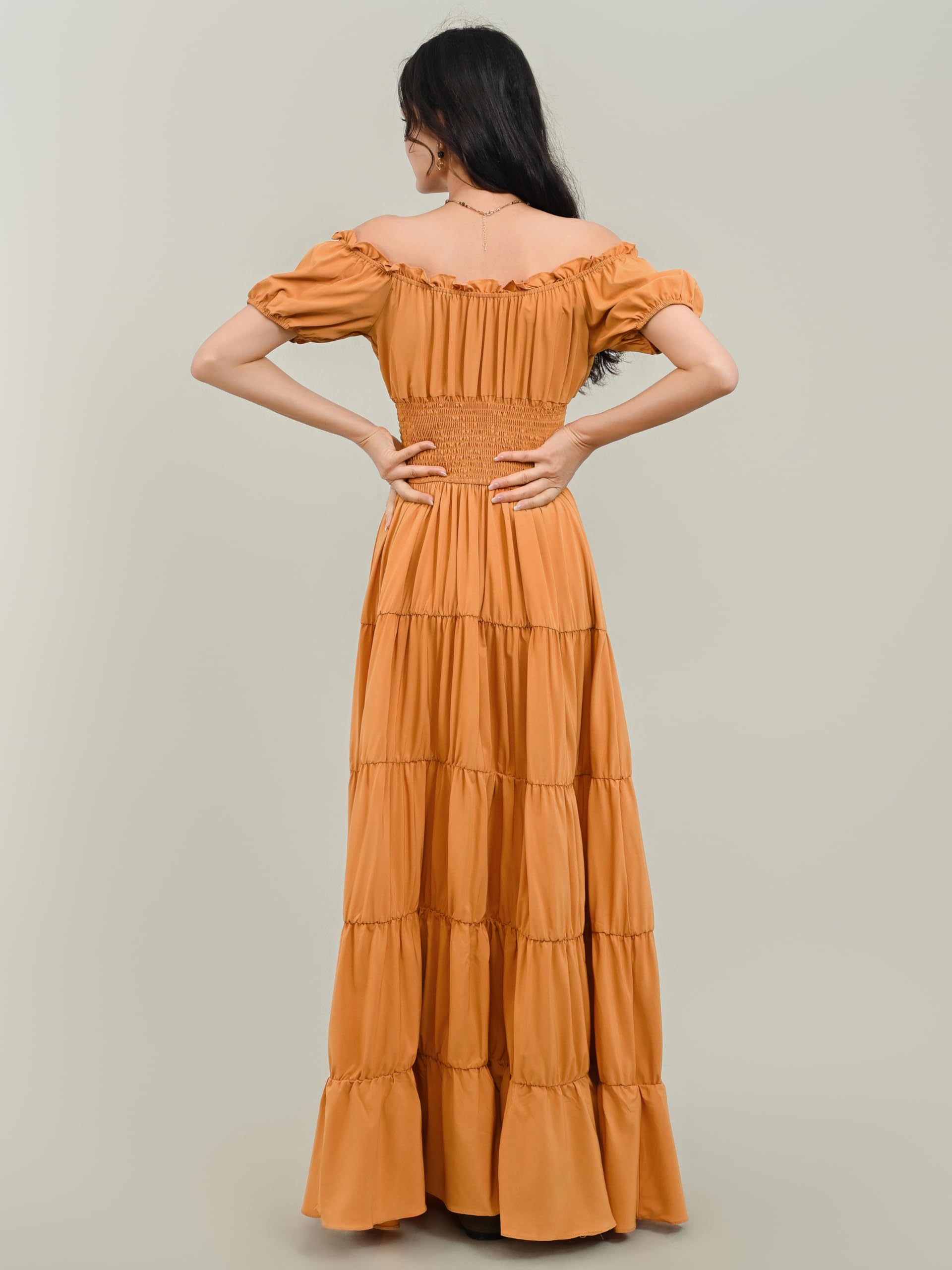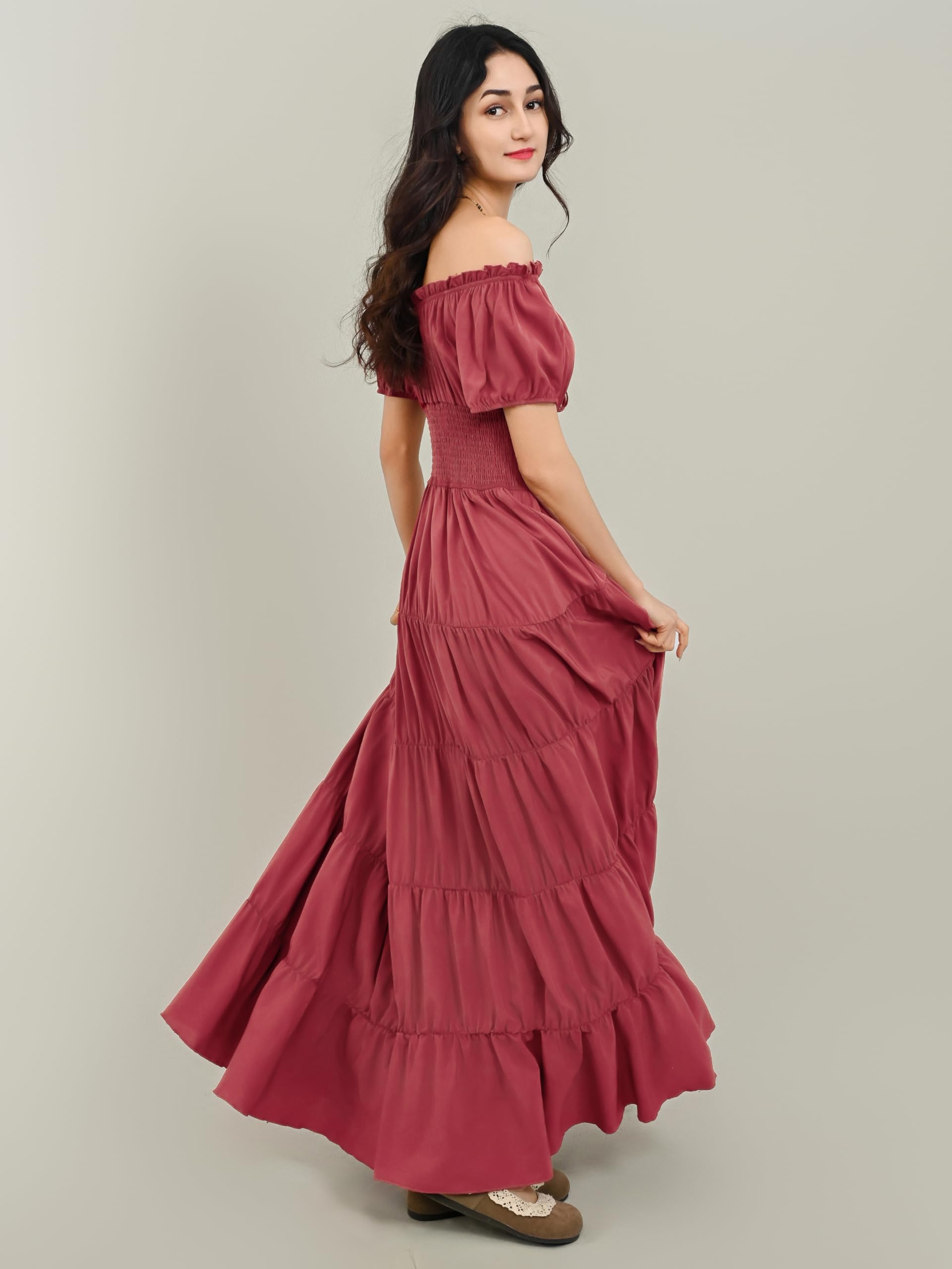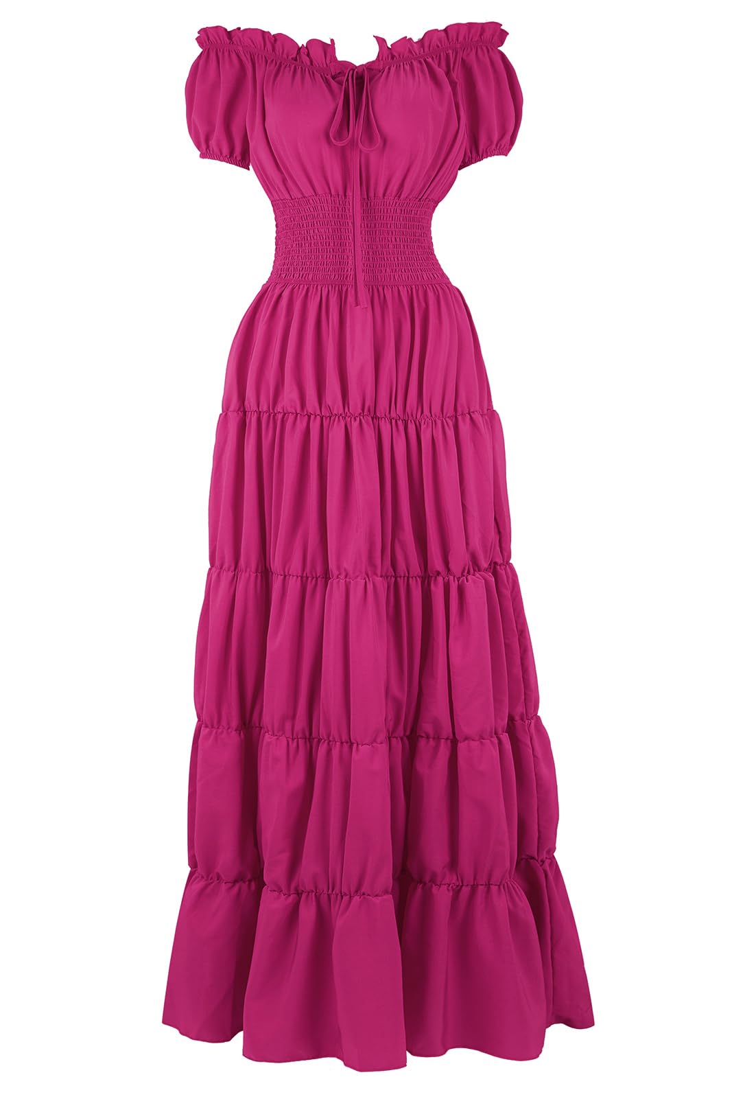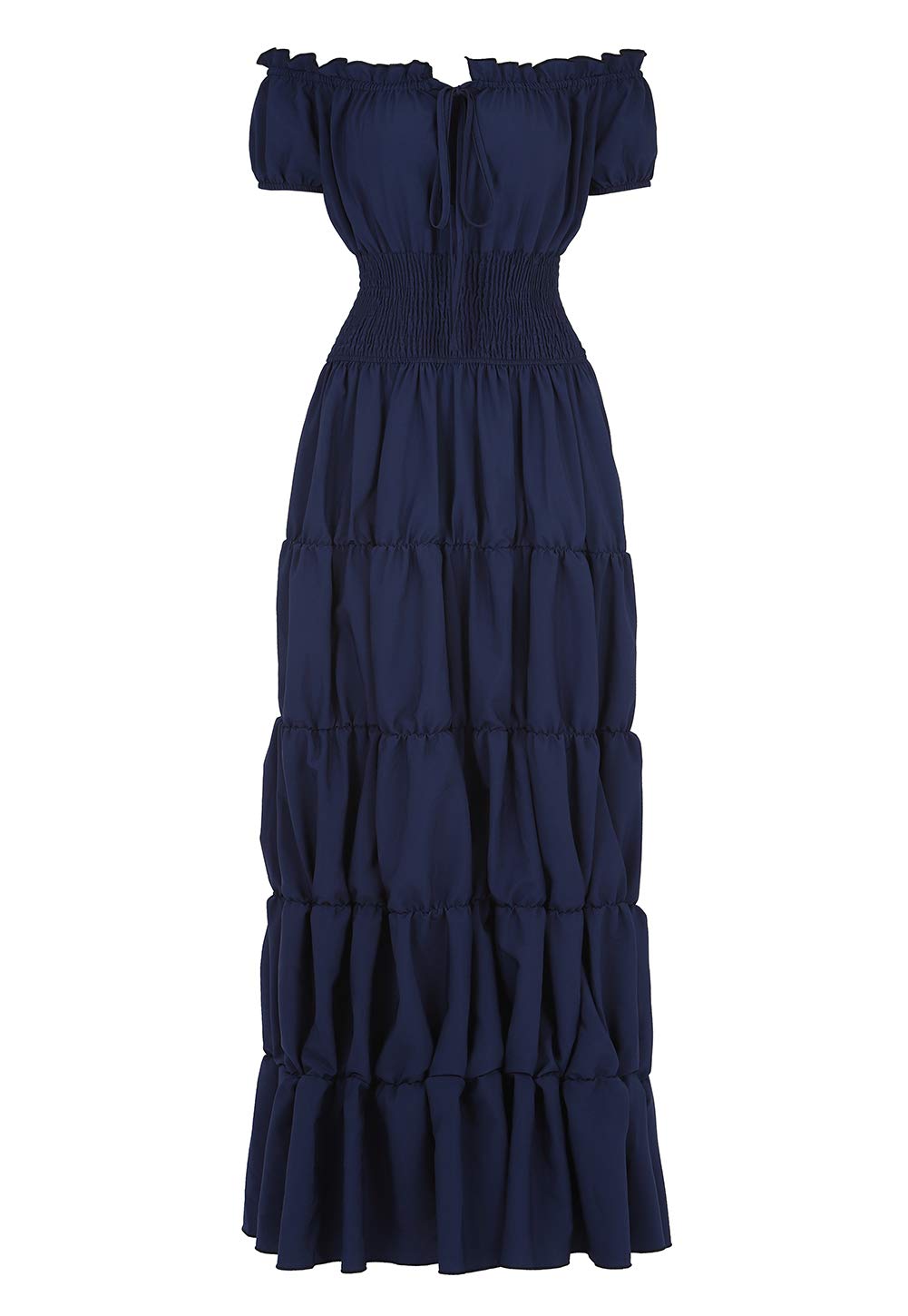 The Viola off-shoulder dress blends rustic elegance with playful femininity. Featuring a flattering smocked bodice, soft ruffle sleeves, and a flowing tiered skirt, this maxi is made for twirling – whether you're barefoot in a meadow or dancing under fairy lights.