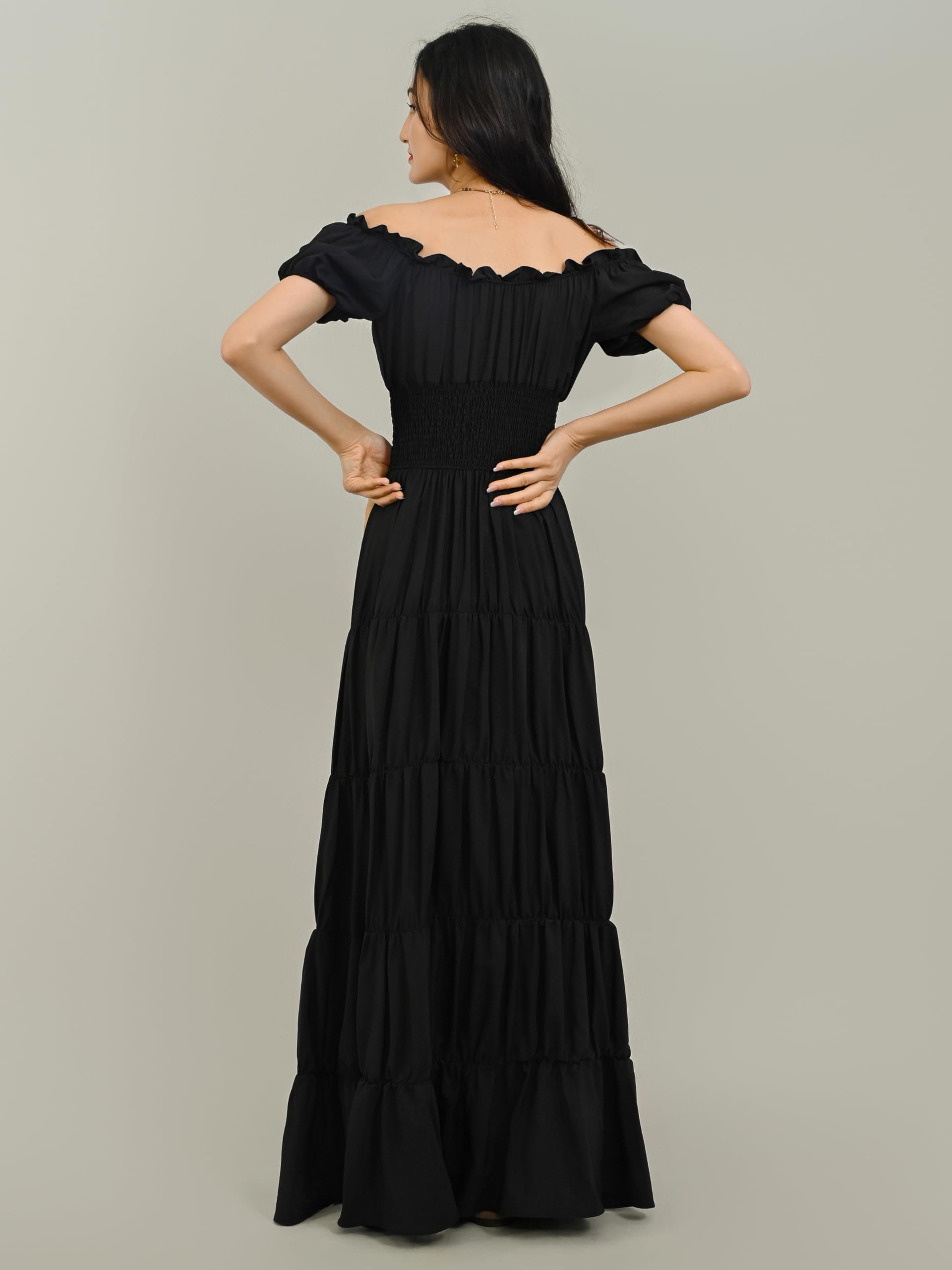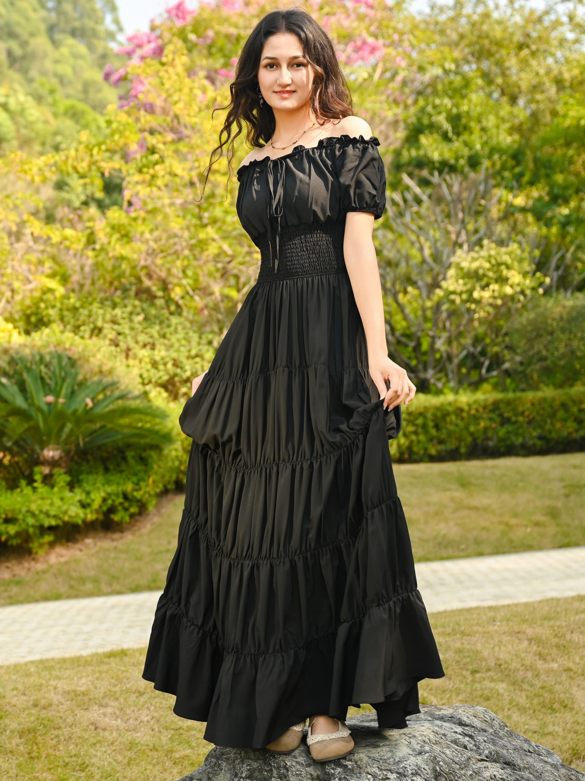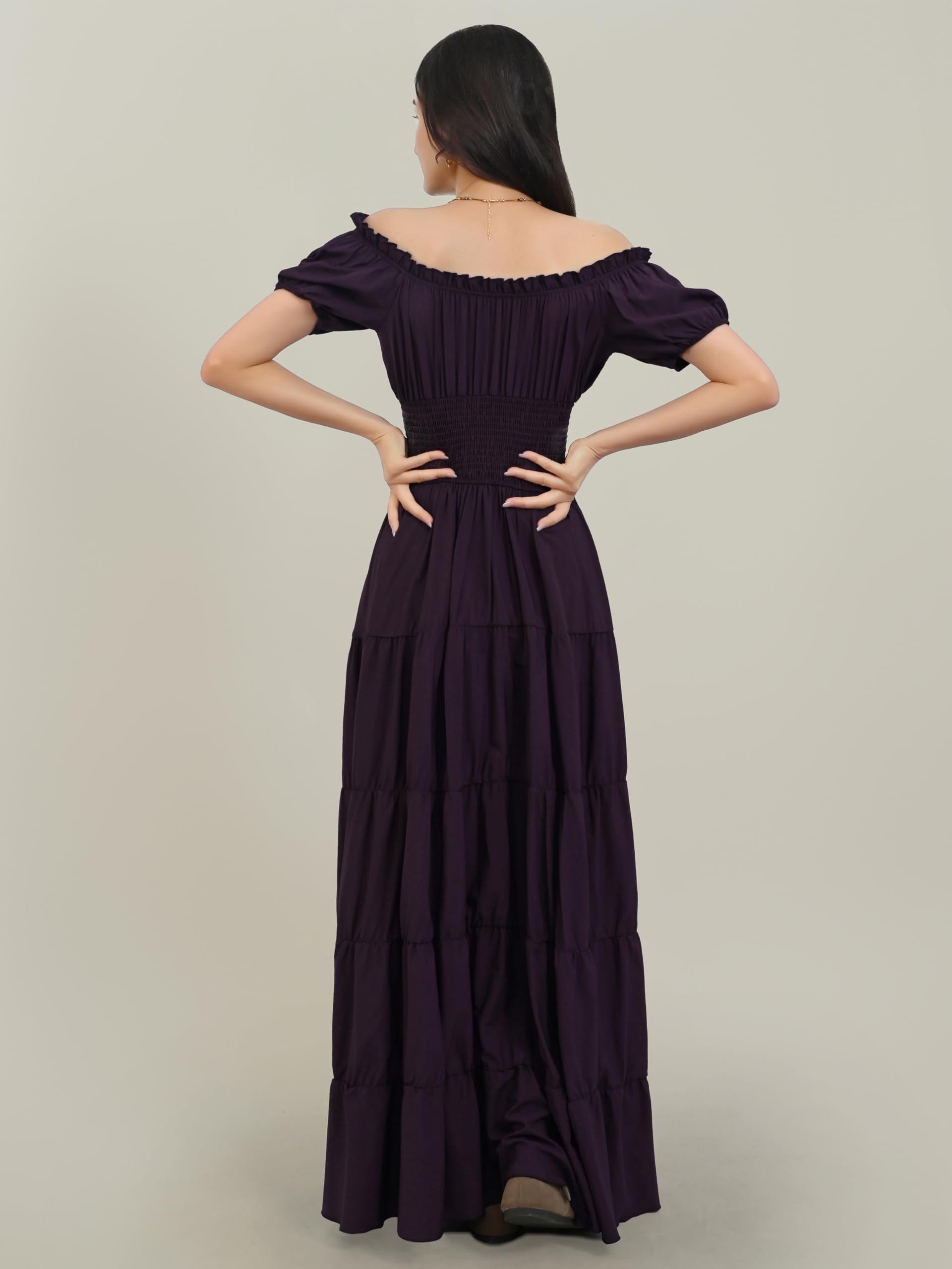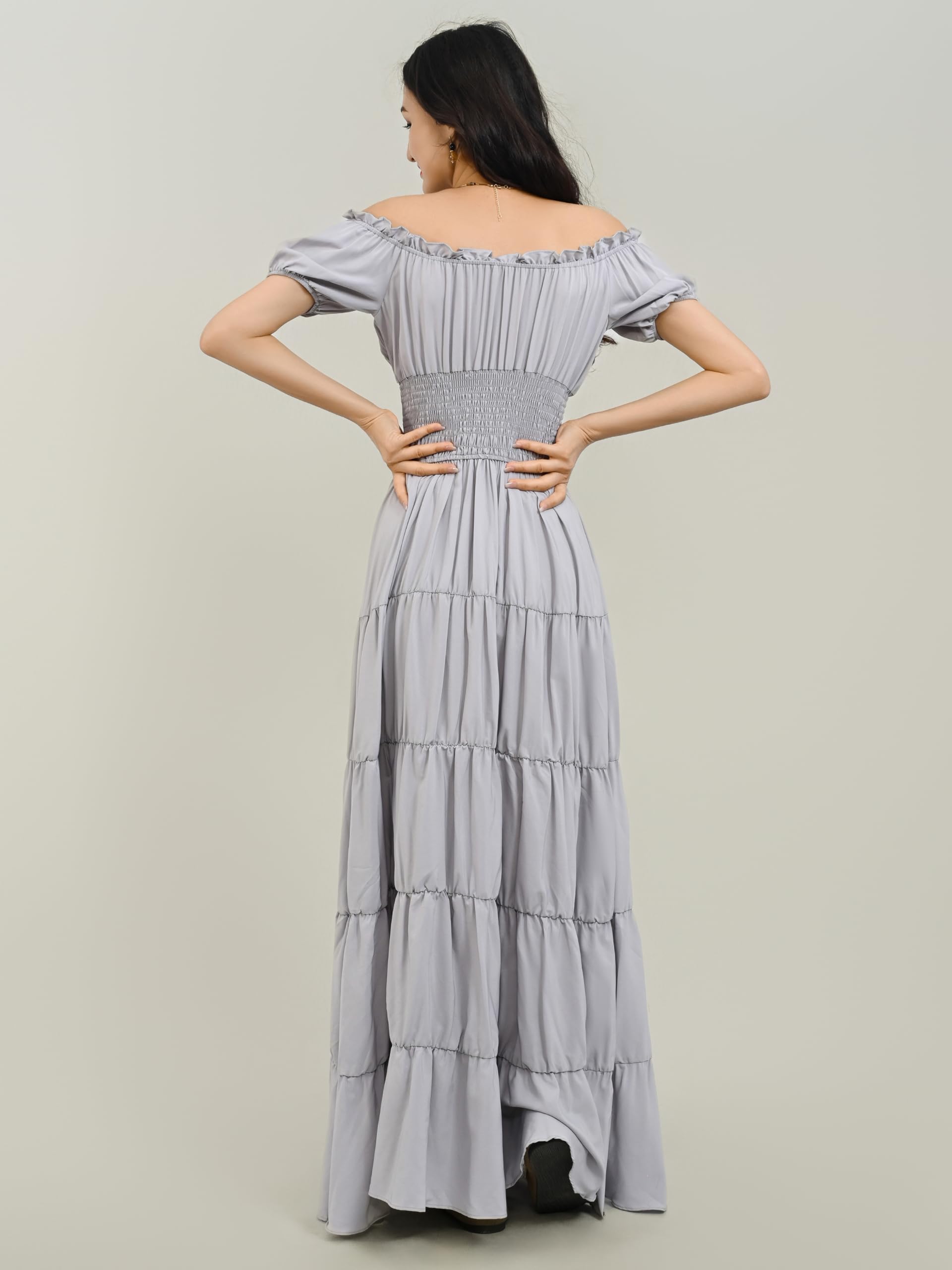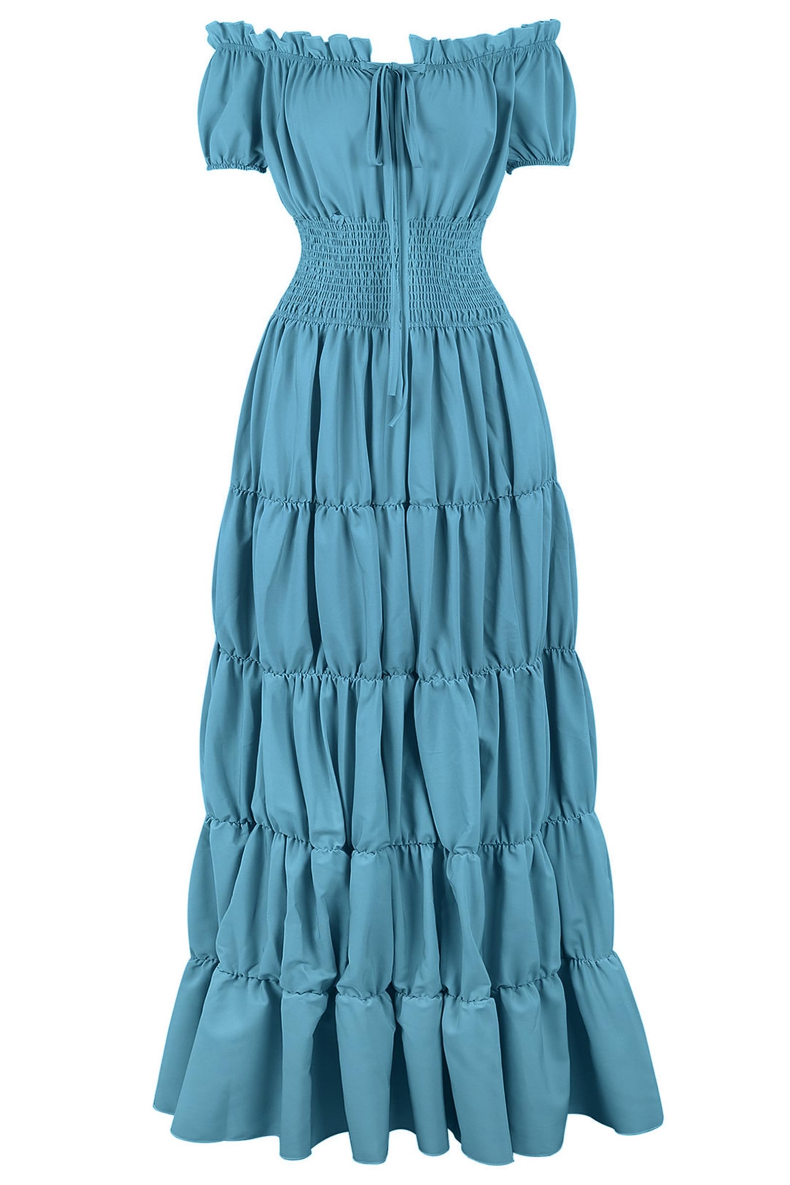 The Viola off-shoulder dress blends rustic elegance with playful femininity. Featuring a flattering smocked bodice, soft ruffle sleeves, and a flowing tiered skirt, this maxi is made for twirling – whether you're barefoot in a meadow or dancing under fairy lights.