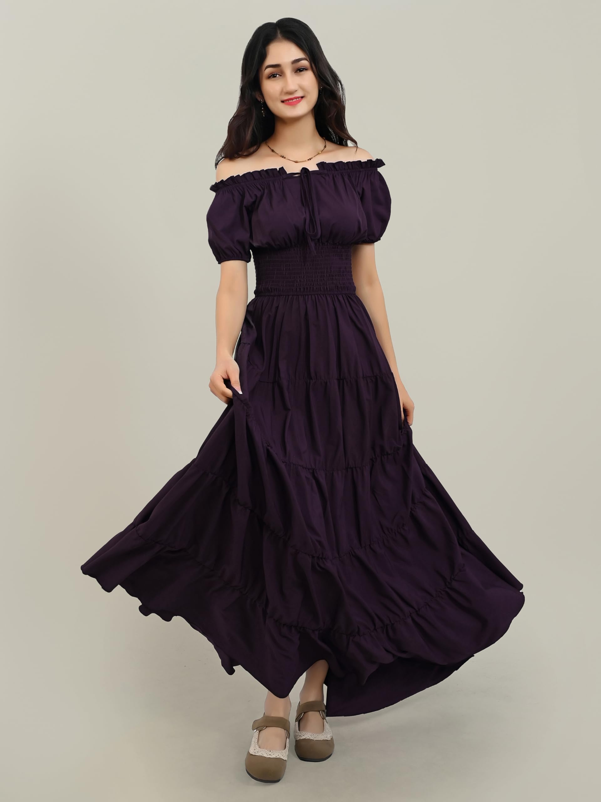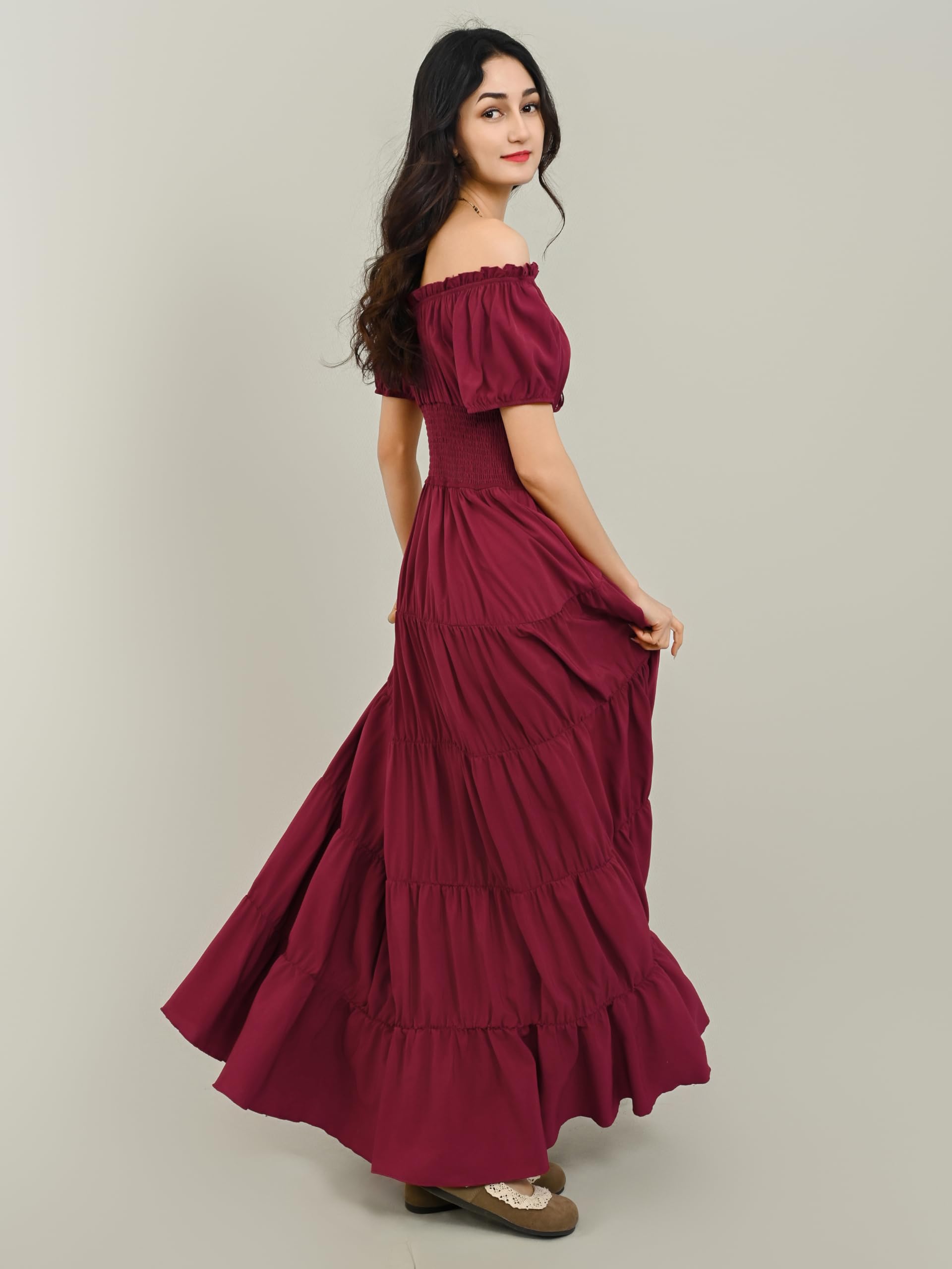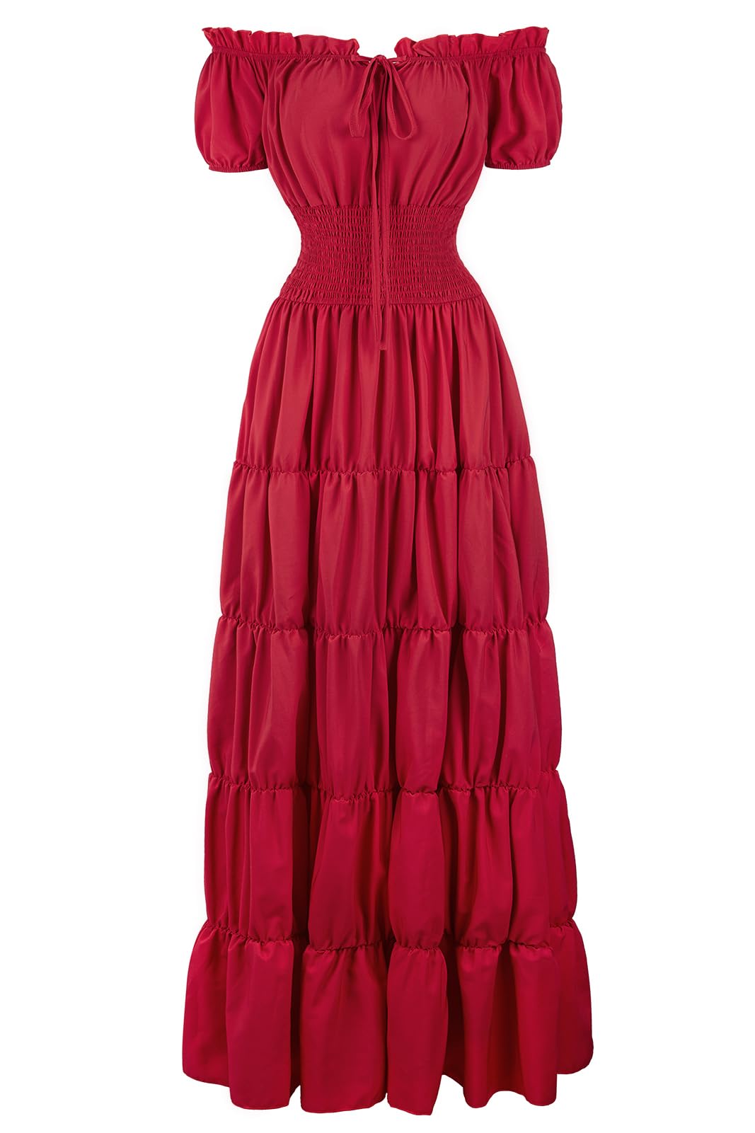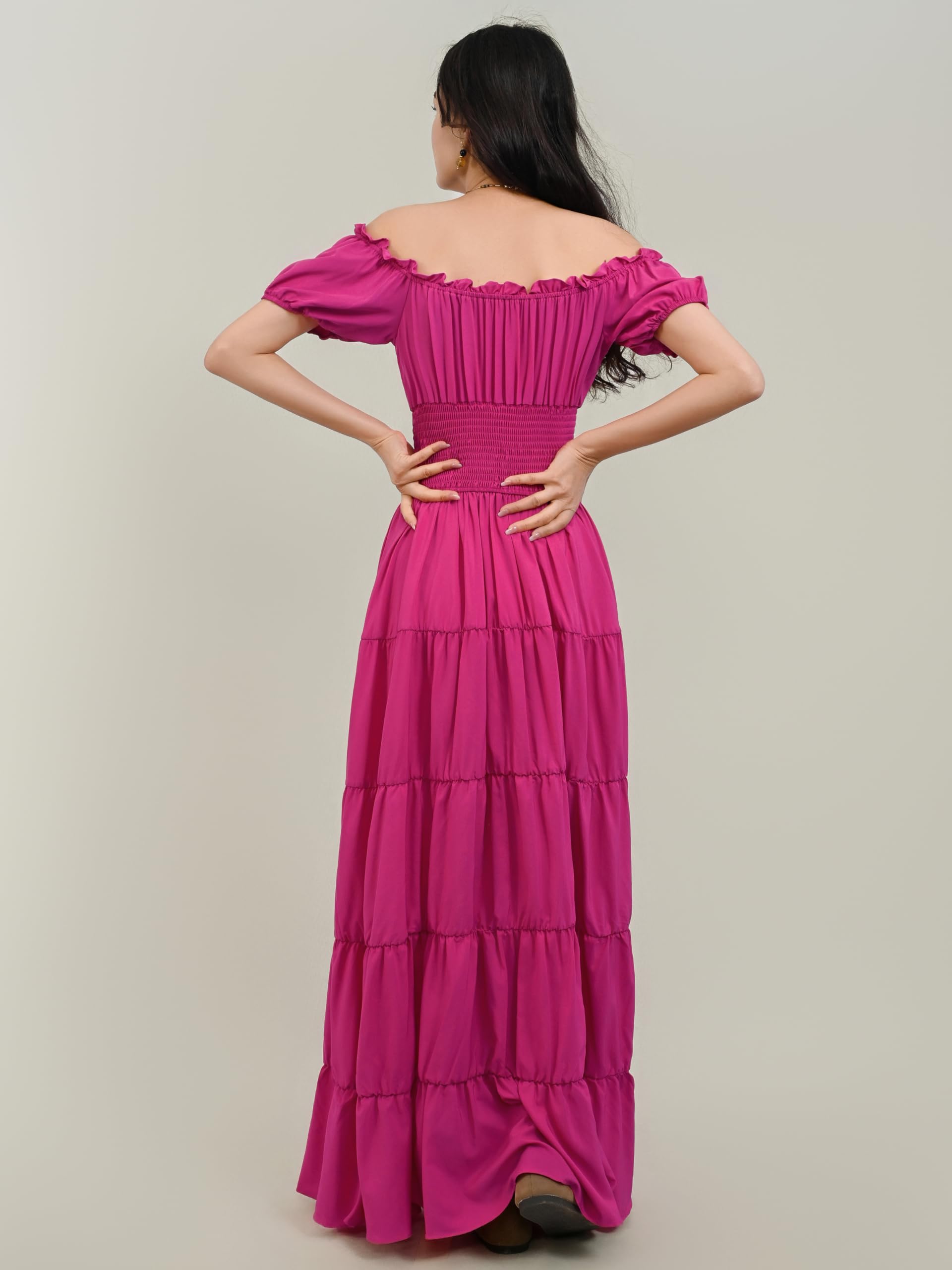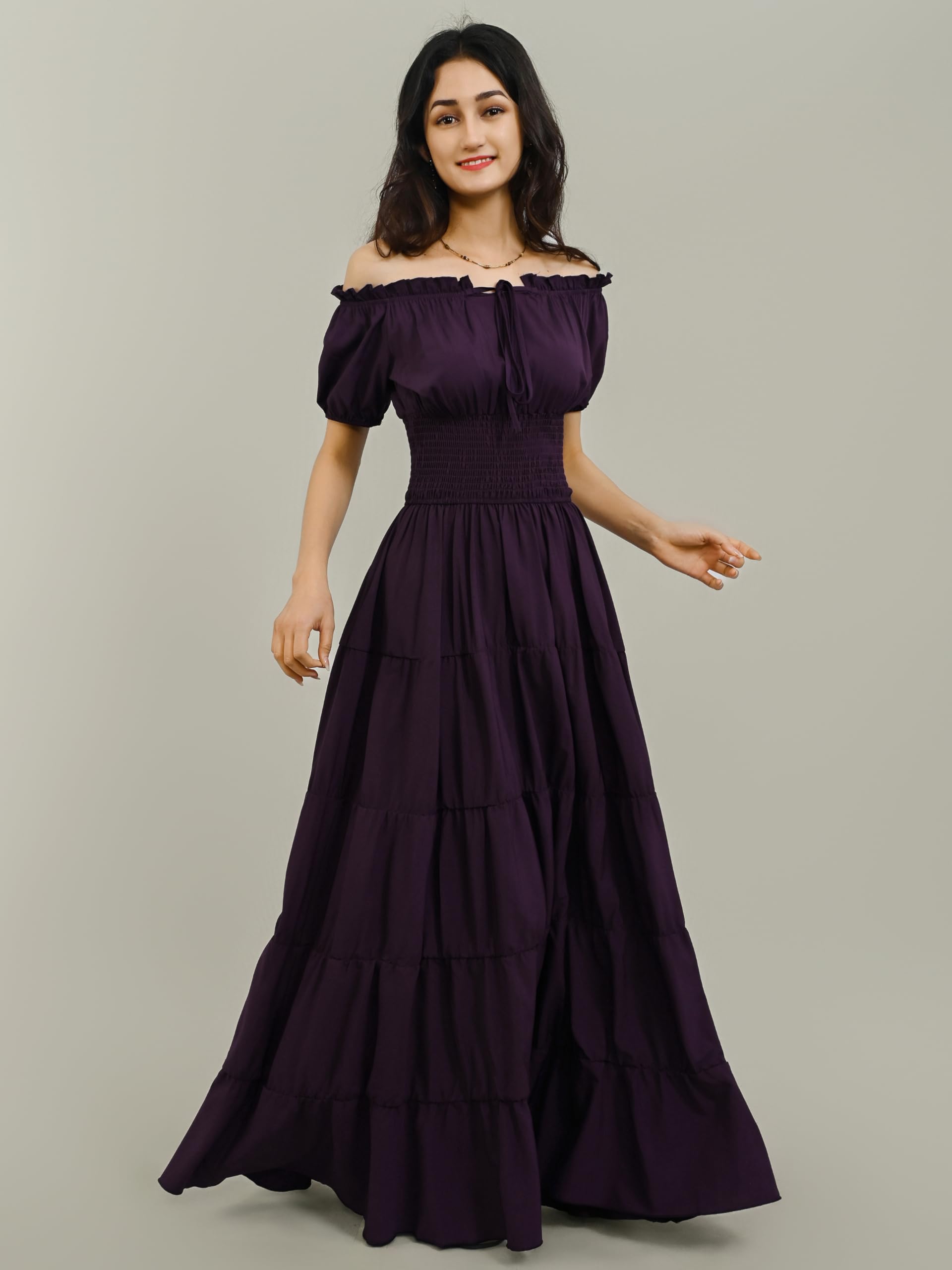 The Viola off-shoulder dress blends rustic elegance with playful femininity. Featuring a flattering smocked bodice, soft ruffle sleeves, and a flowing tiered skirt, this maxi is made for twirling – whether you're barefoot in a meadow or dancing under fairy lights.