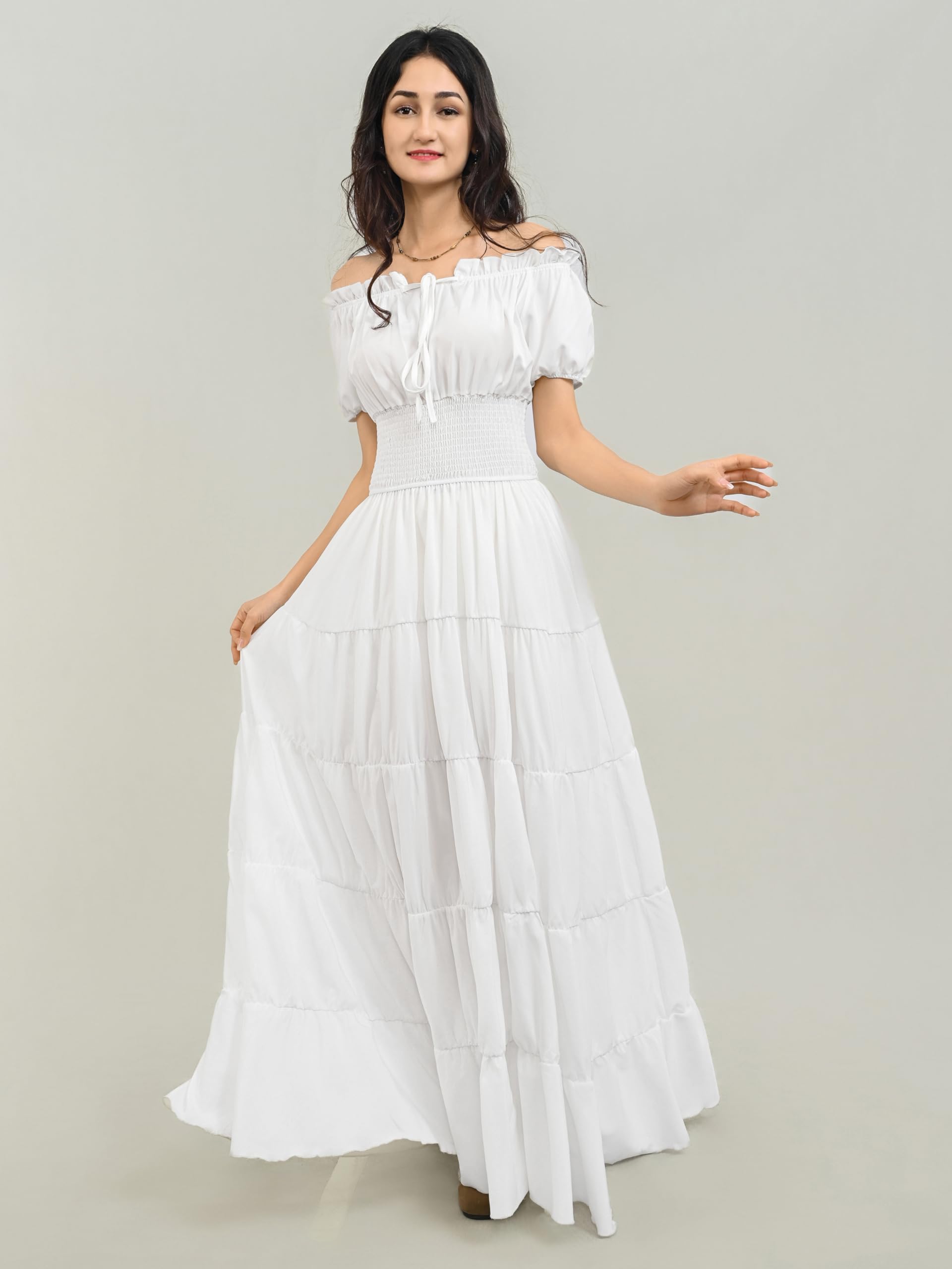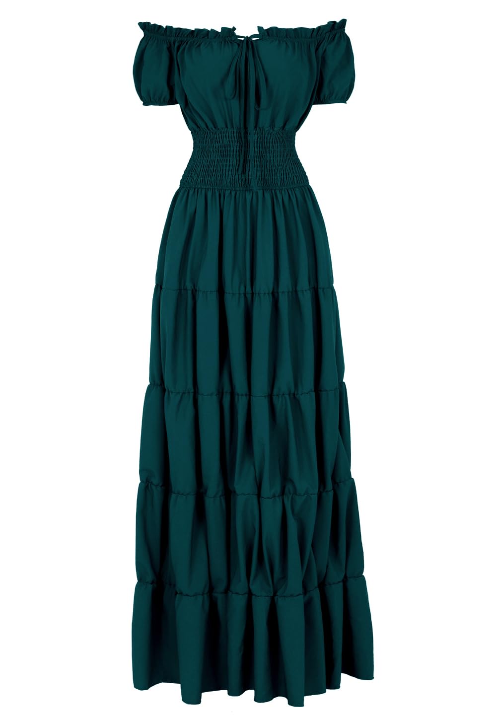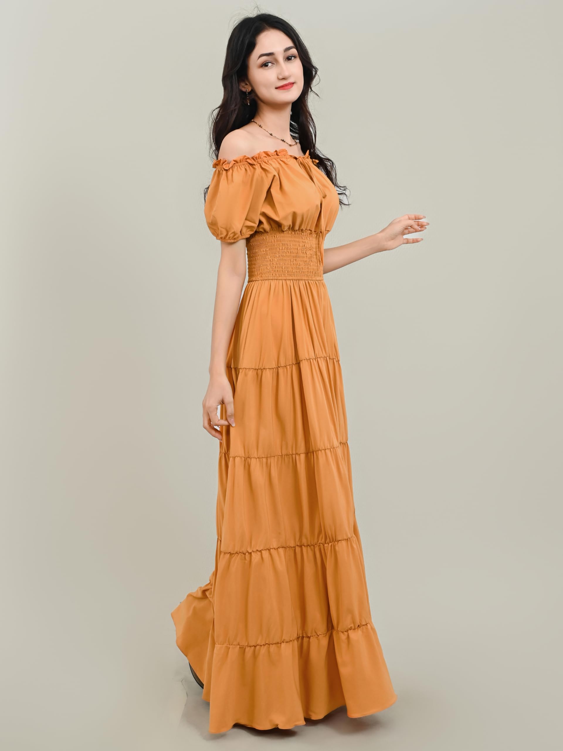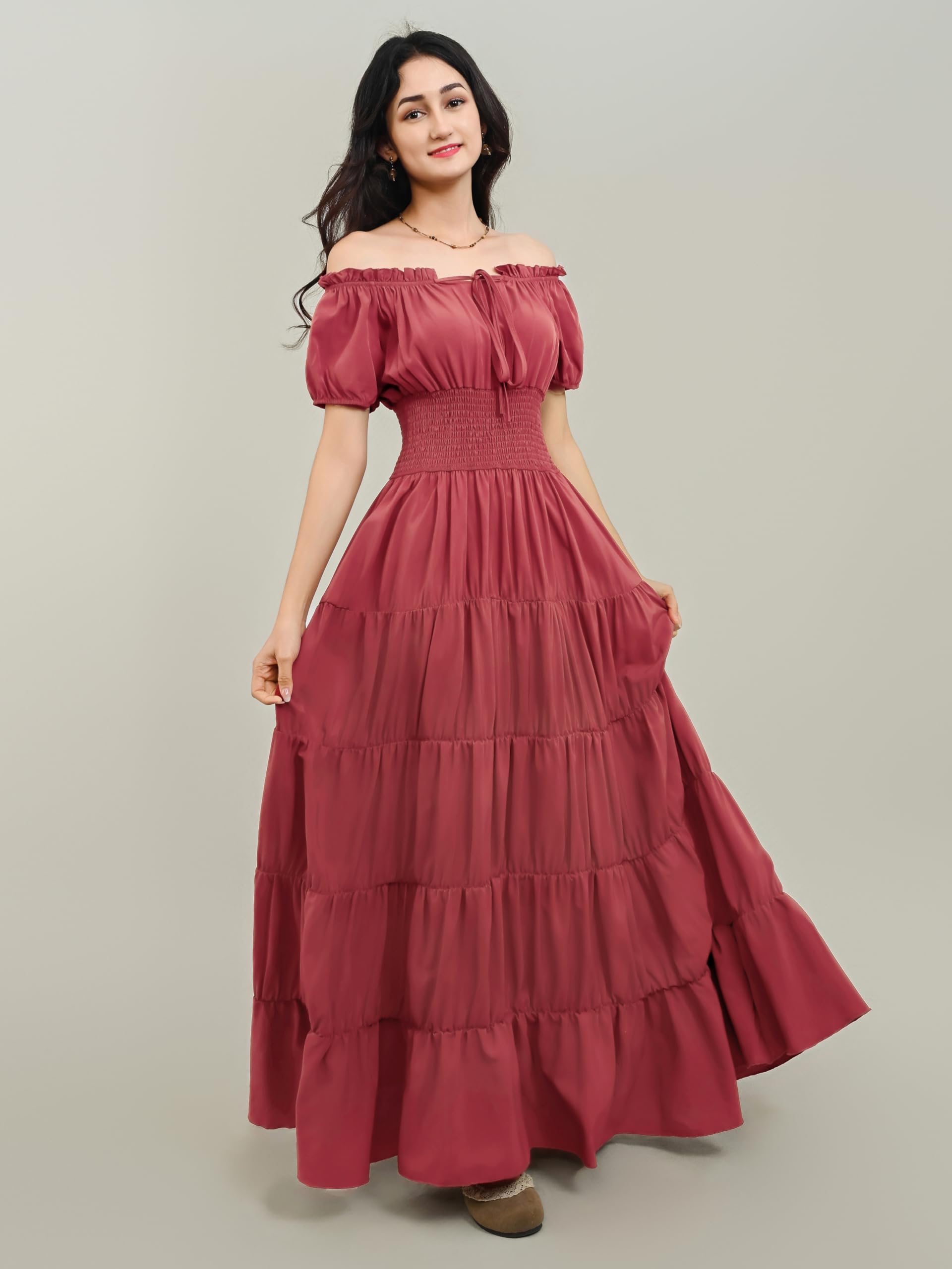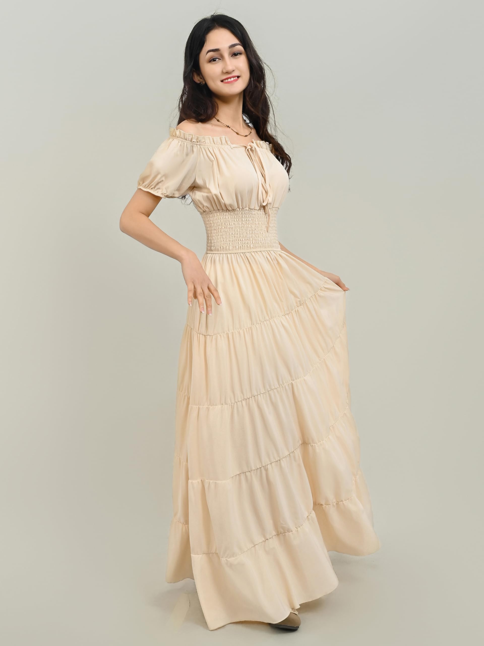 The Viola off-shoulder dress blends rustic elegance with playful femininity. Featuring a flattering smocked bodice, soft ruffle sleeves, and a flowing tiered skirt, this maxi is made for twirling – whether you're barefoot in a meadow or dancing under fairy lights.