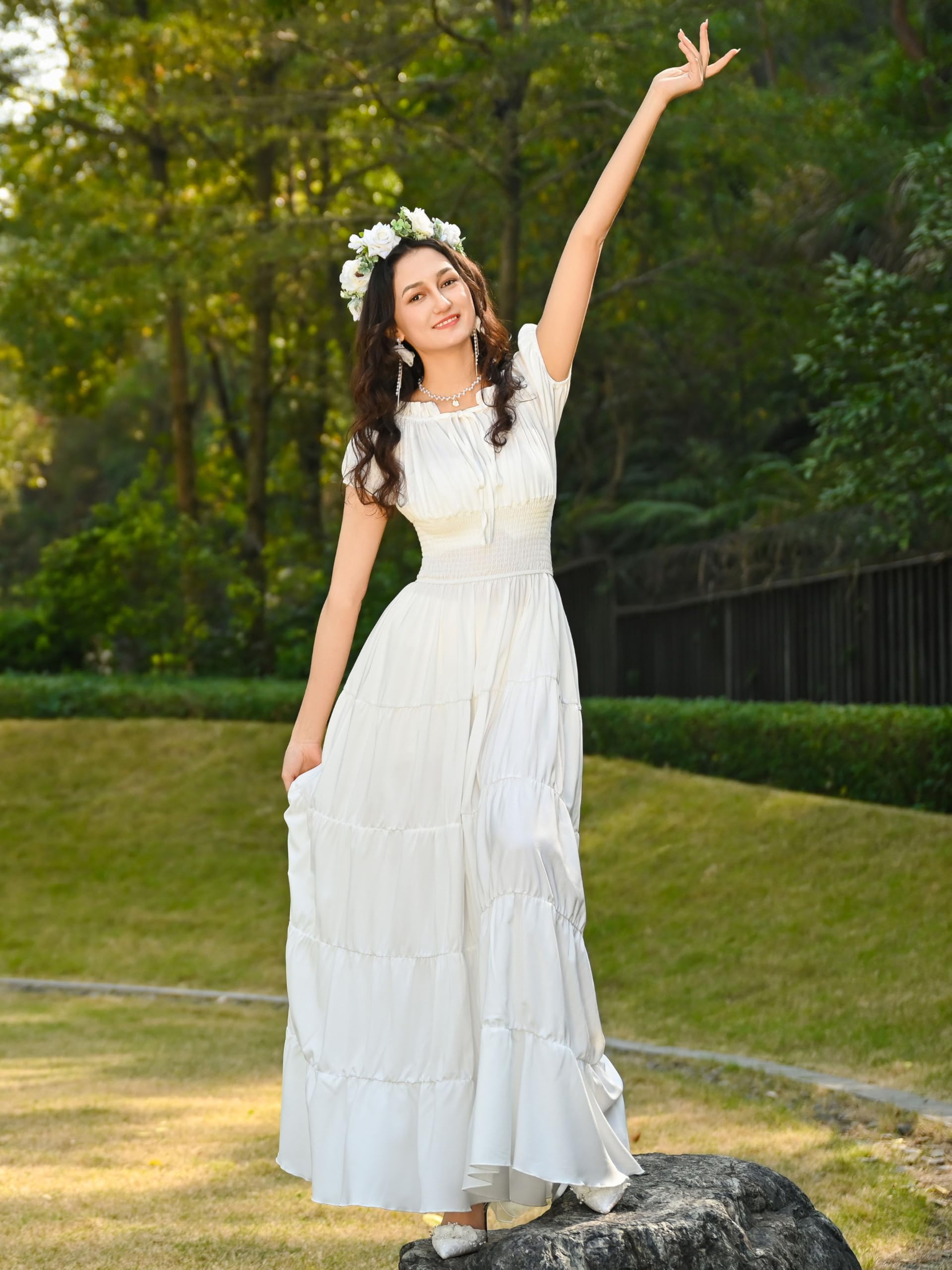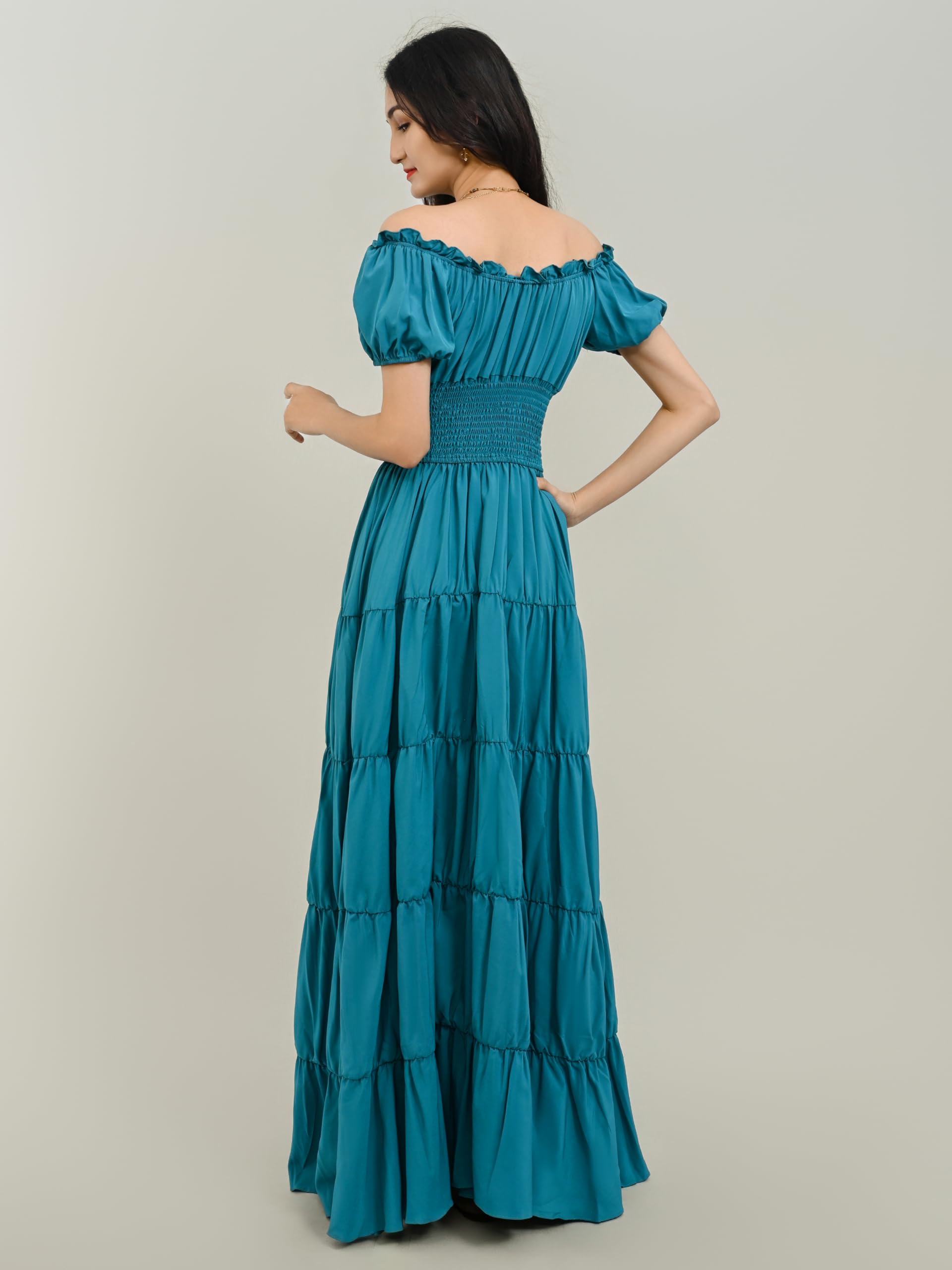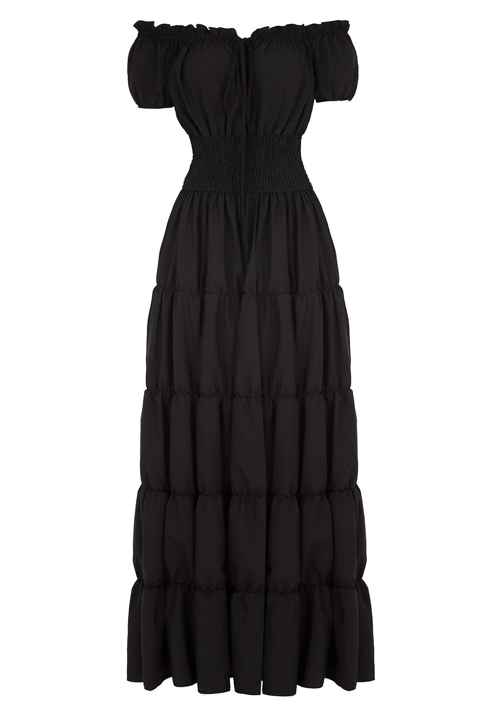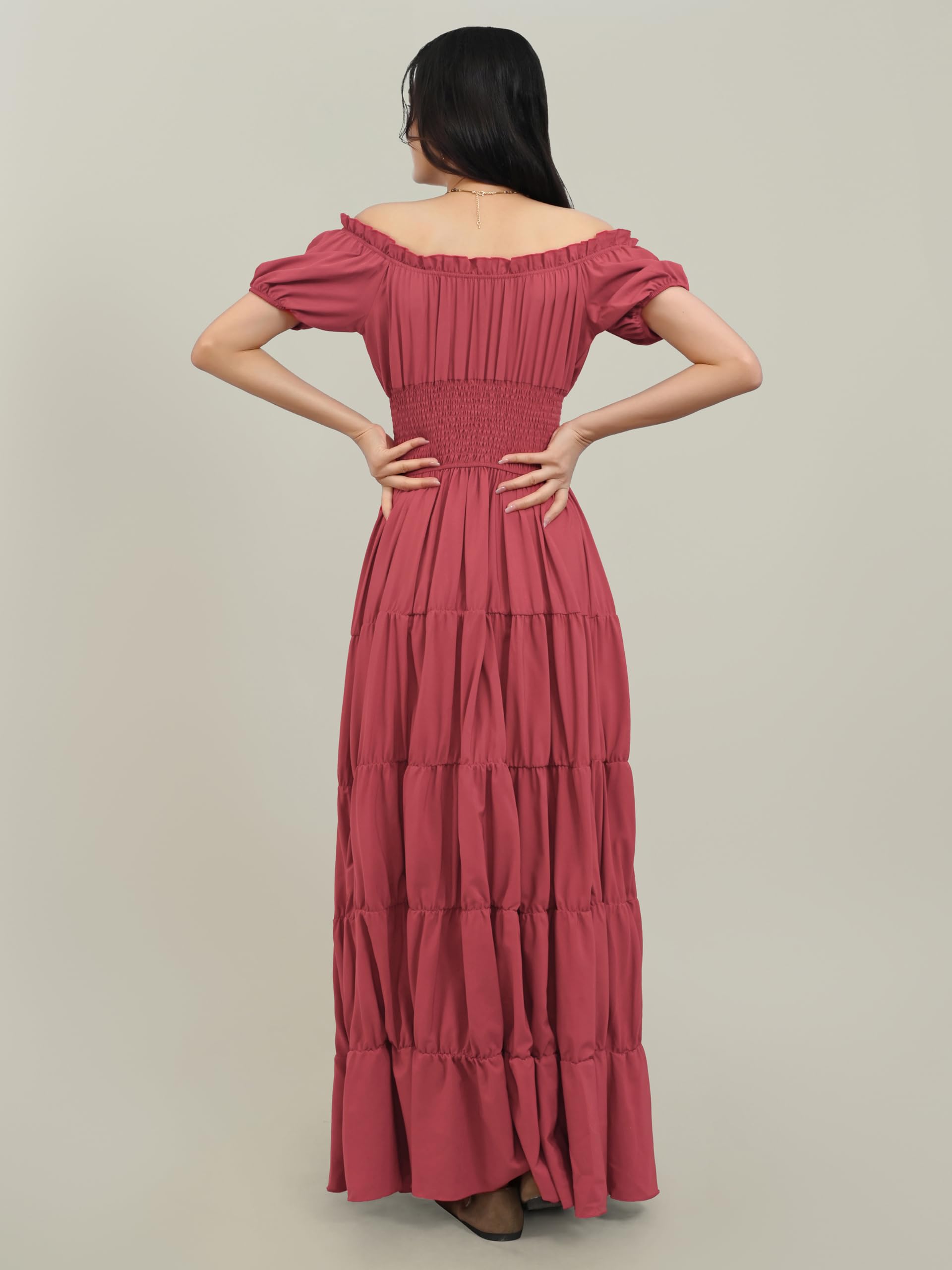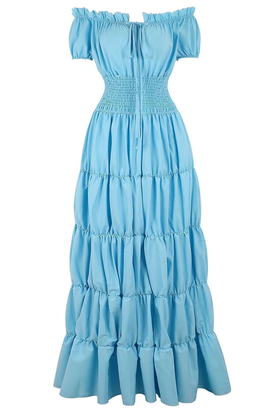 The Viola off-shoulder dress blends rustic elegance with playful femininity. Featuring a flattering smocked bodice, soft ruffle sleeves, and a flowing tiered skirt, this maxi is made for twirling – whether you're barefoot in a meadow or dancing under fairy lights.