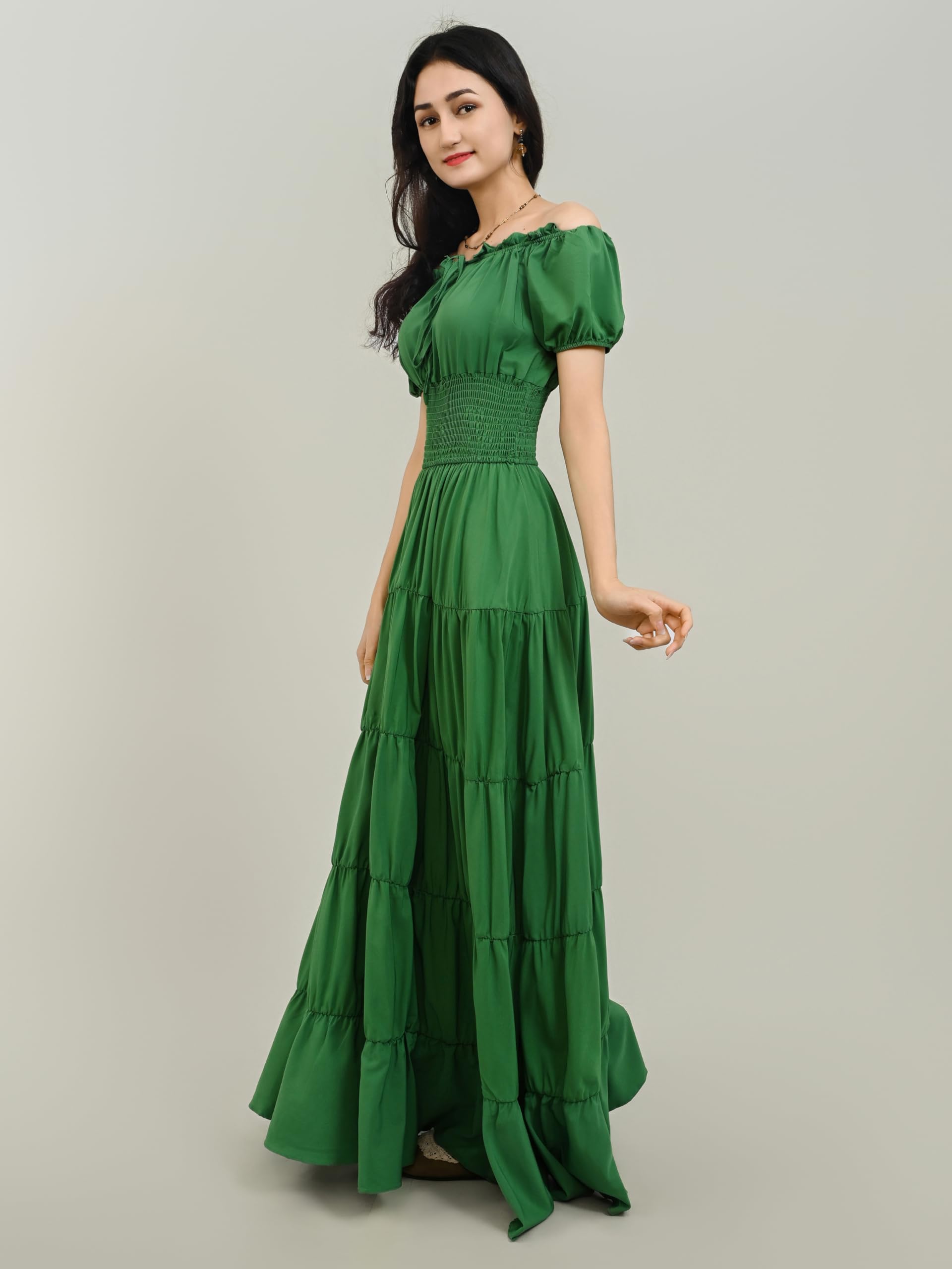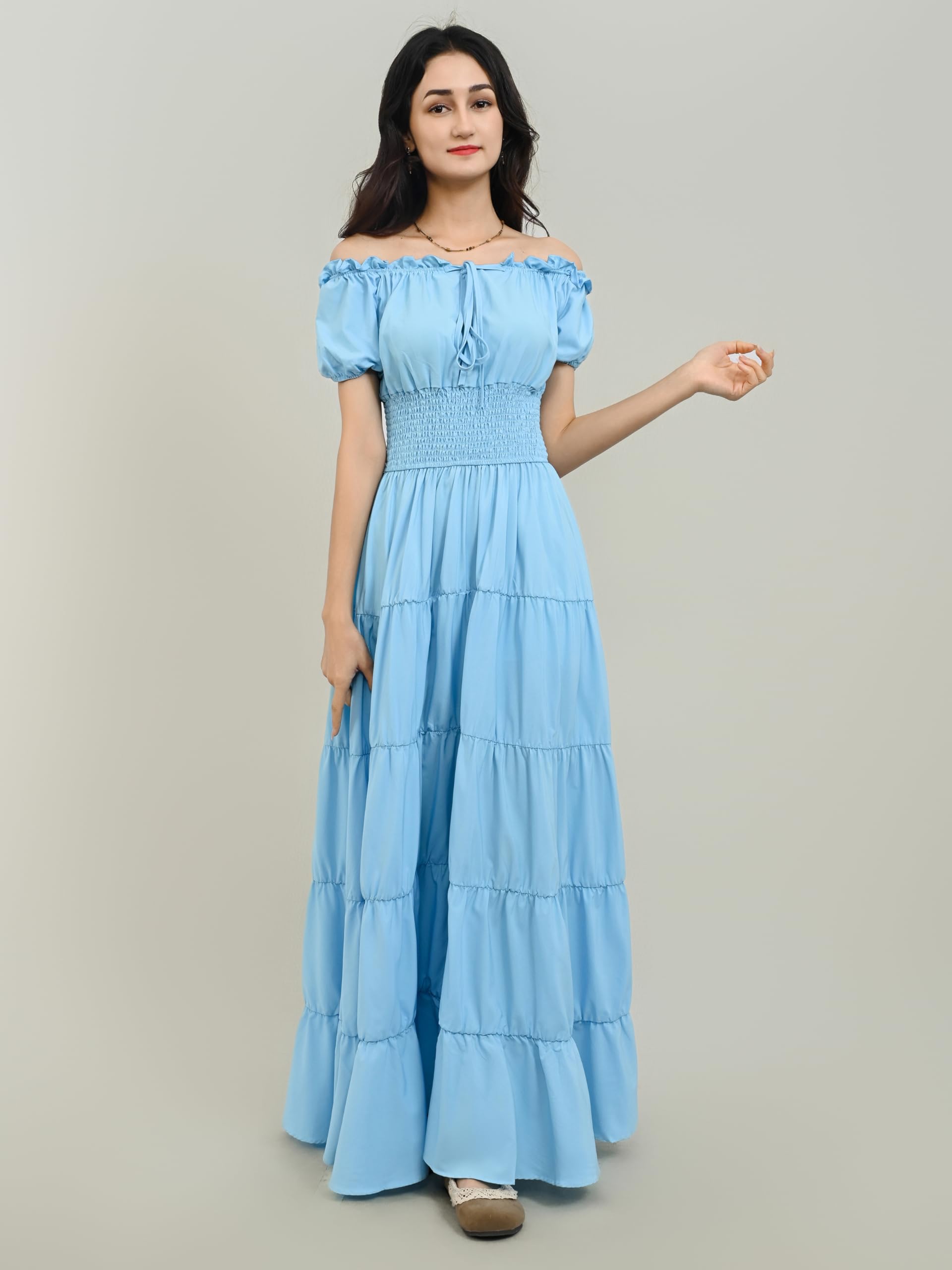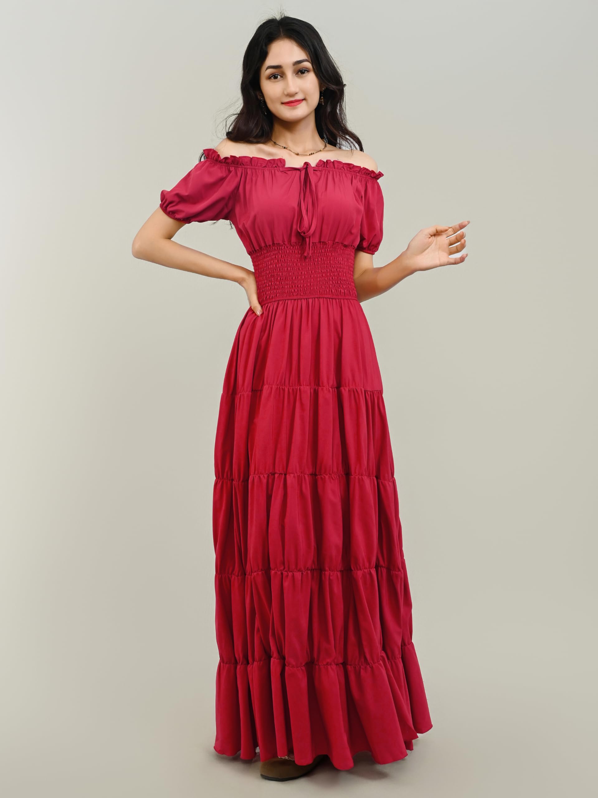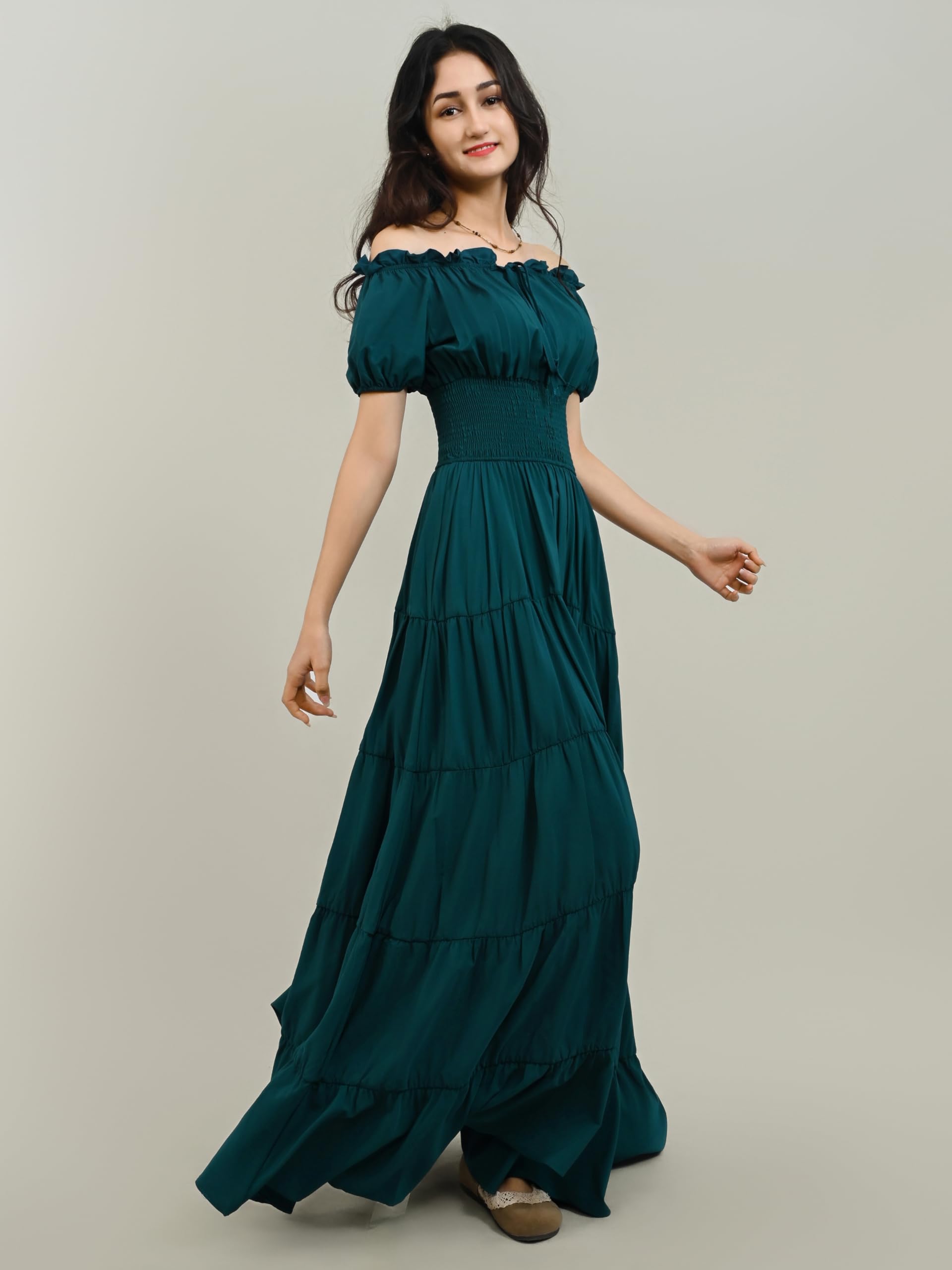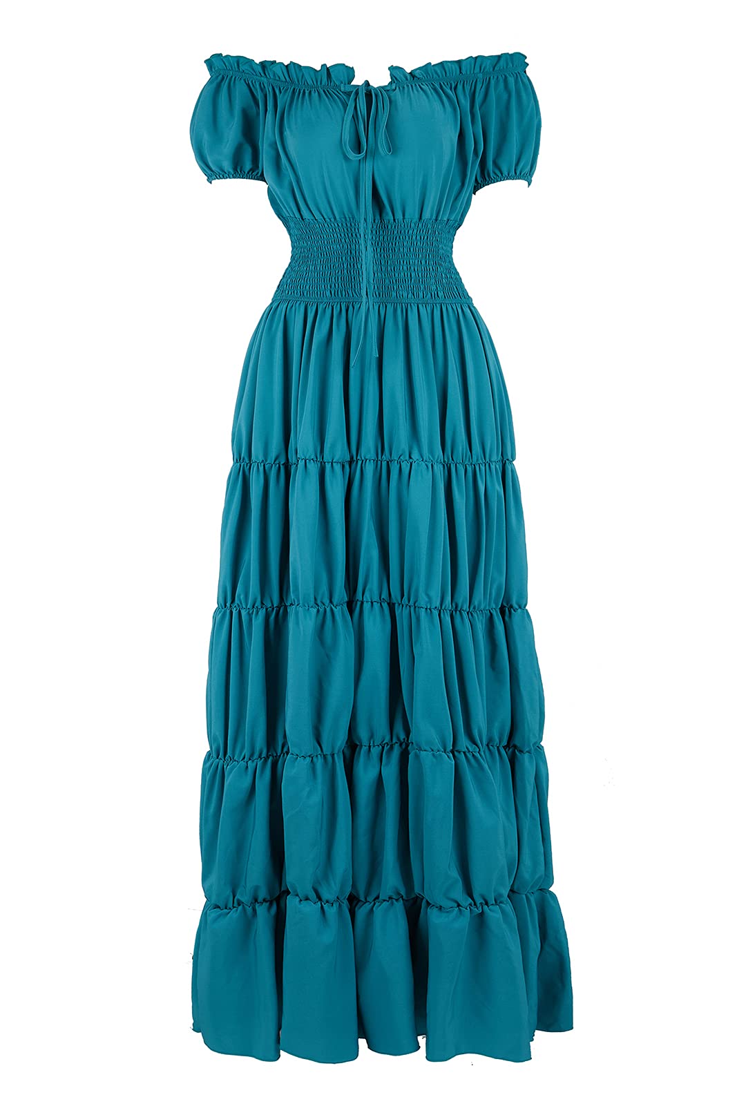 The Viola off-shoulder dress blends rustic elegance with playful femininity. Featuring a flattering smocked bodice, soft ruffle sleeves, and a flowing tiered skirt, this maxi is made for twirling – whether you're barefoot in a meadow or dancing under fairy lights.