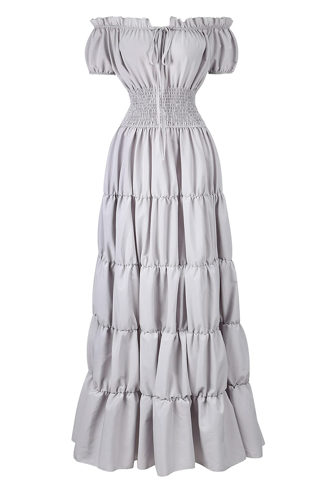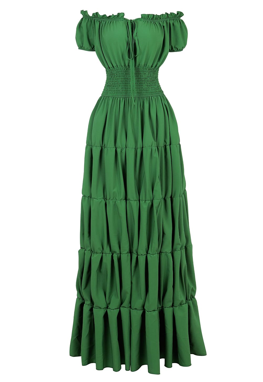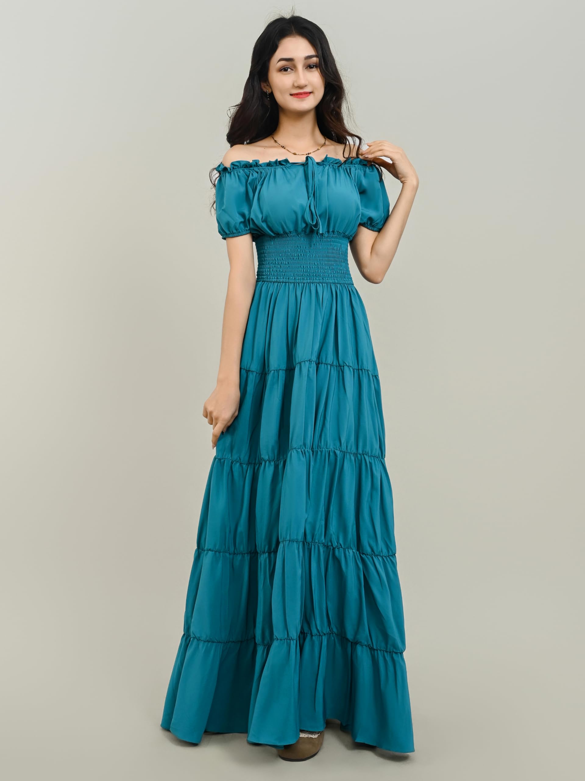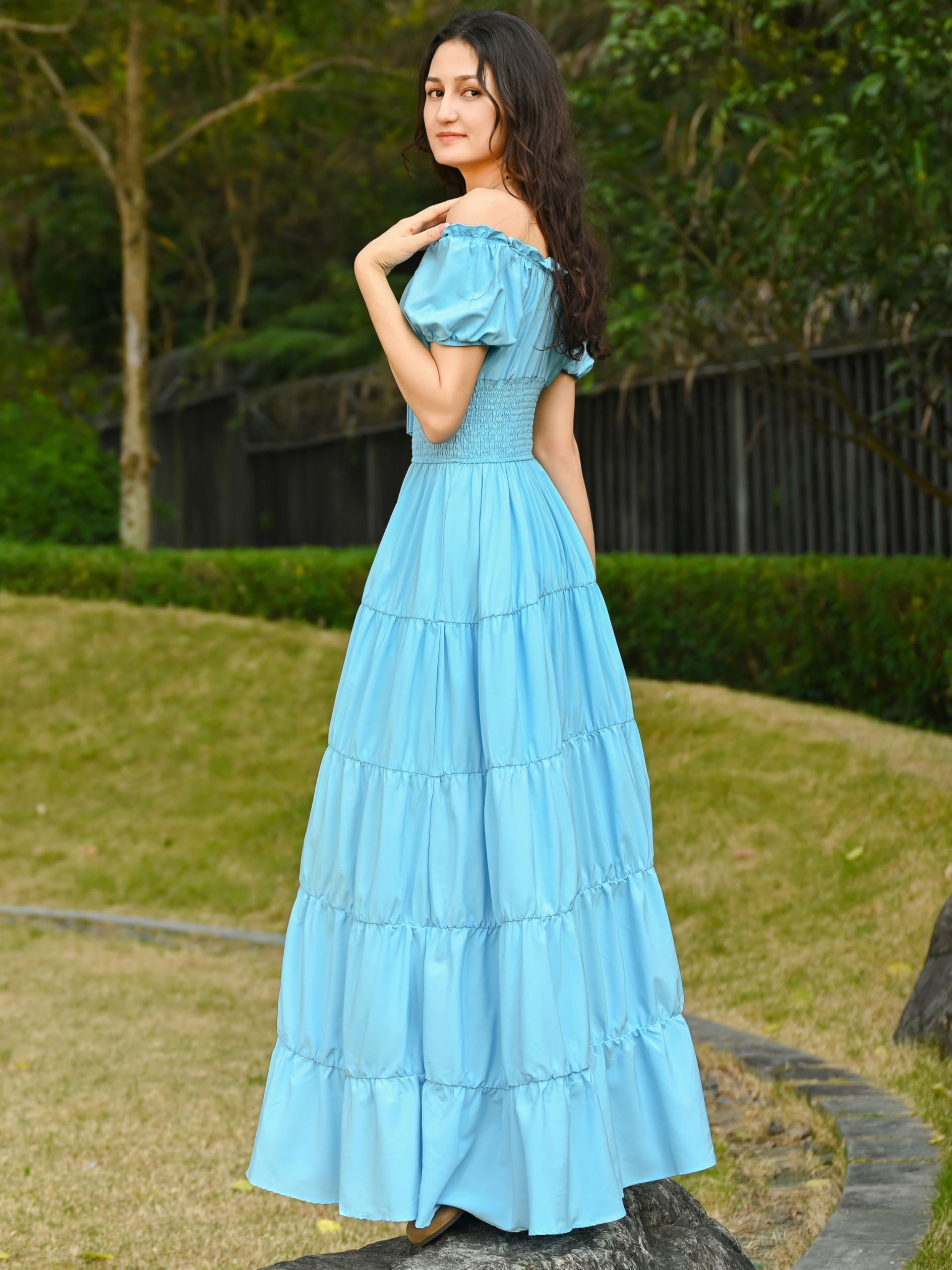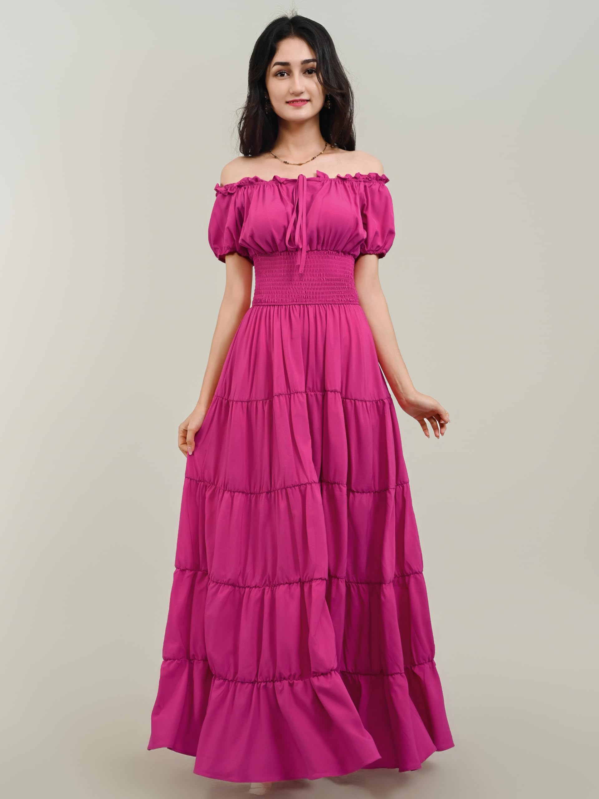 The Viola off-shoulder dress blends rustic elegance with playful femininity. Featuring a flattering smocked bodice, soft ruffle sleeves, and a flowing tiered skirt, this maxi is made for twirling – whether you're barefoot in a meadow or dancing under fairy lights.