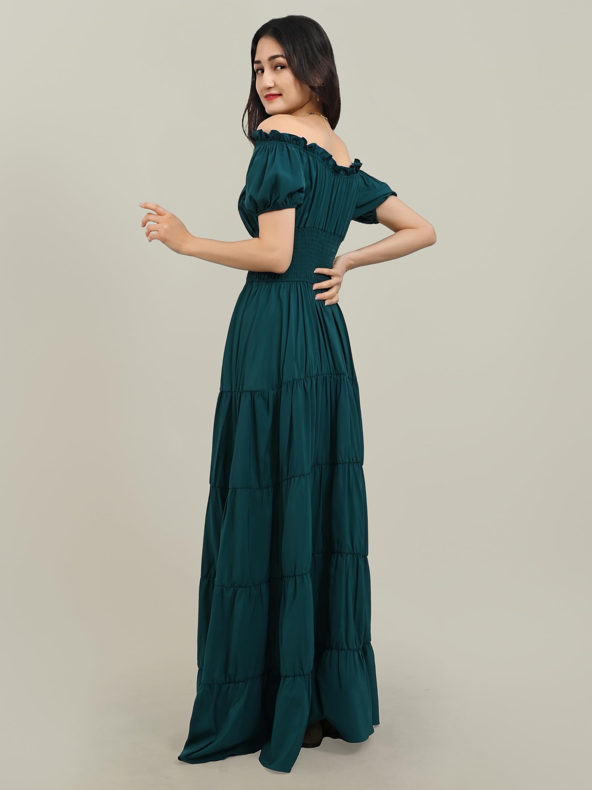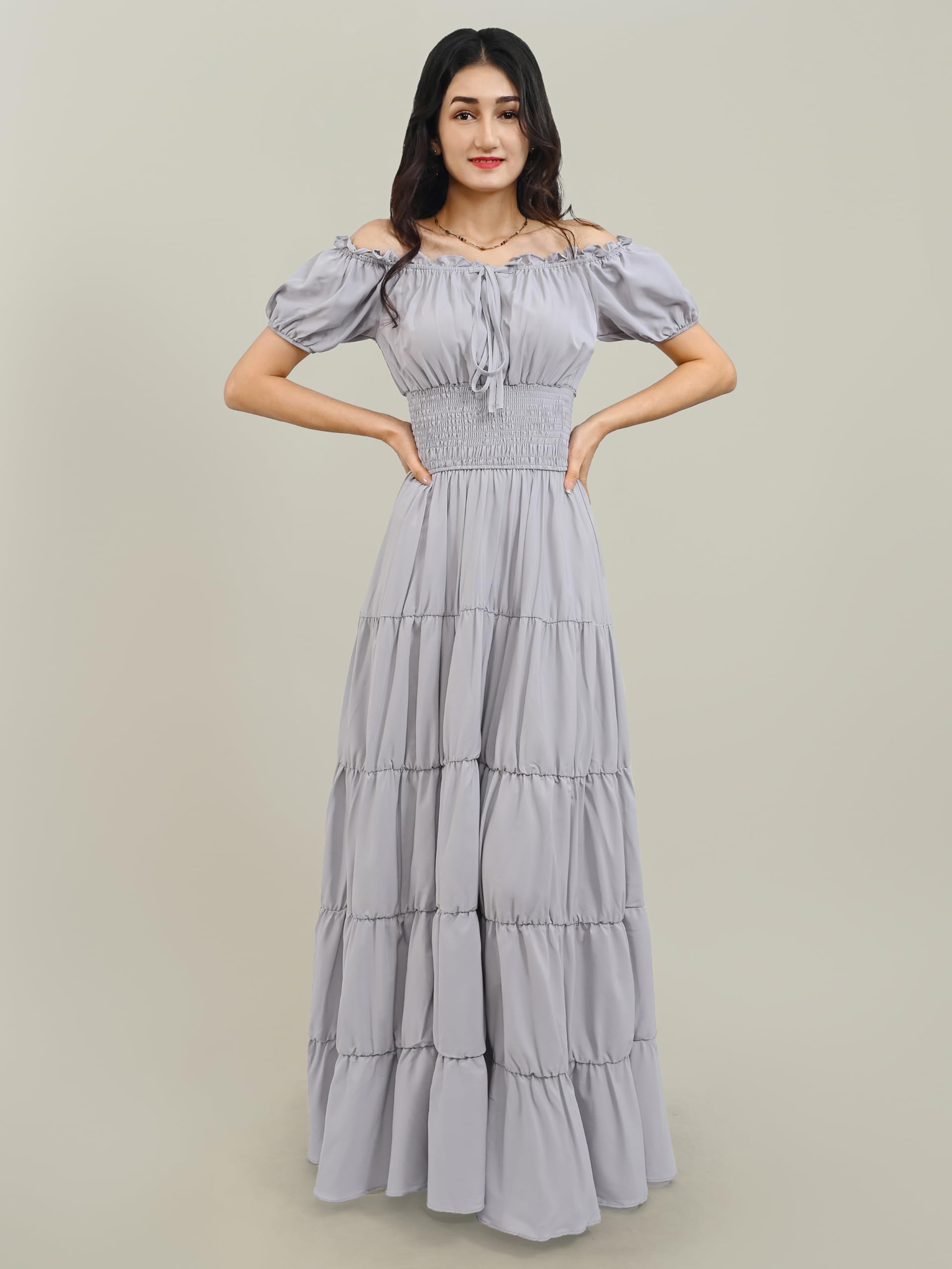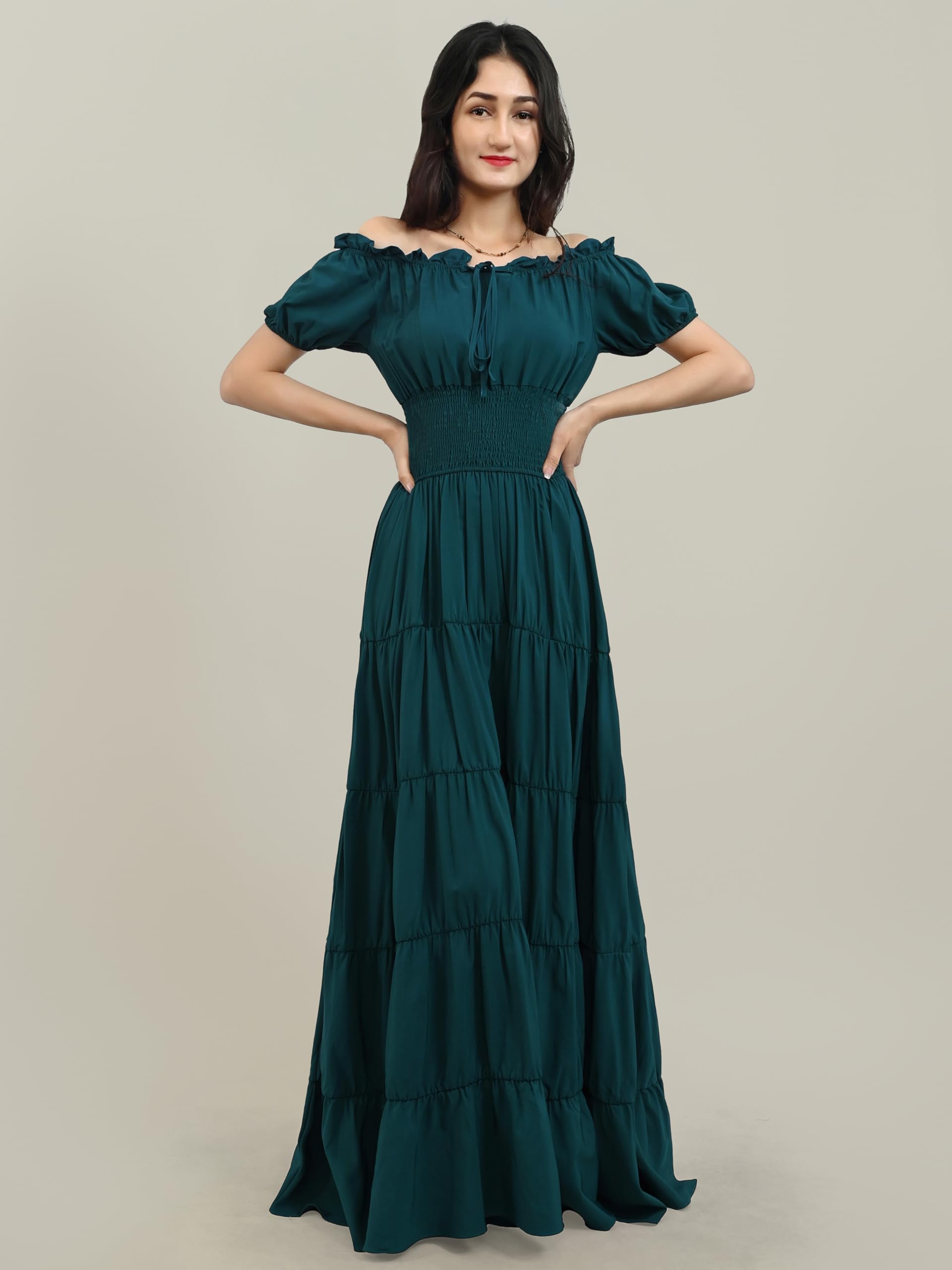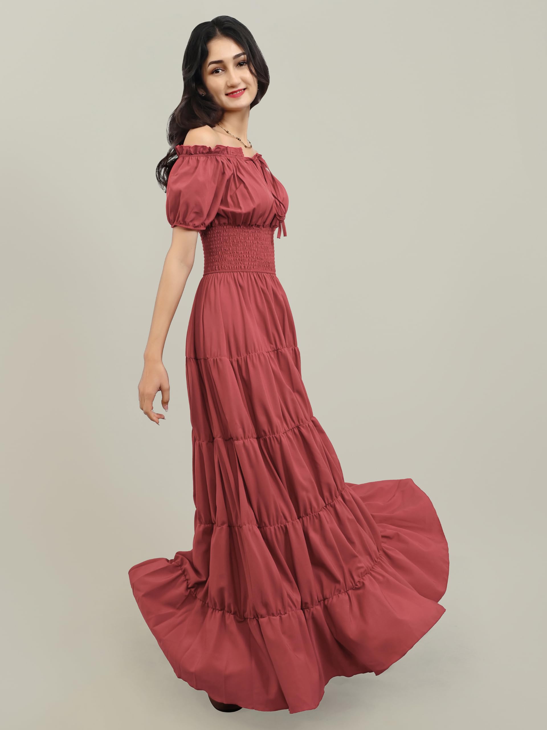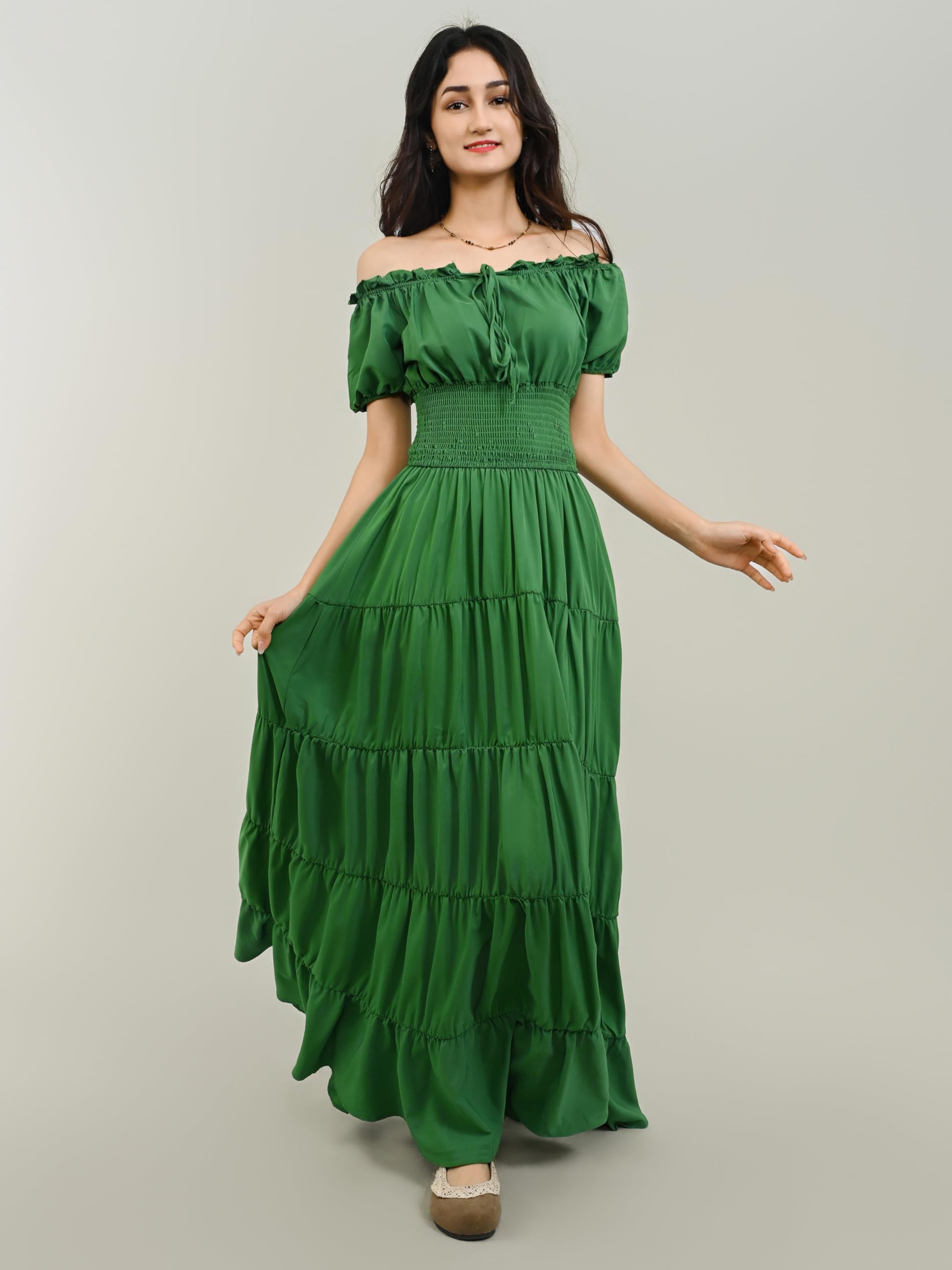The Viola off-shoulder dress blends rustic elegance with playful femininity. Featuring a flattering smocked bodice, soft ruffle sleeves, and a flowing tiered skirt, this maxi is made for twirling – whether you're barefoot in a meadow or dancing under fairy lights.